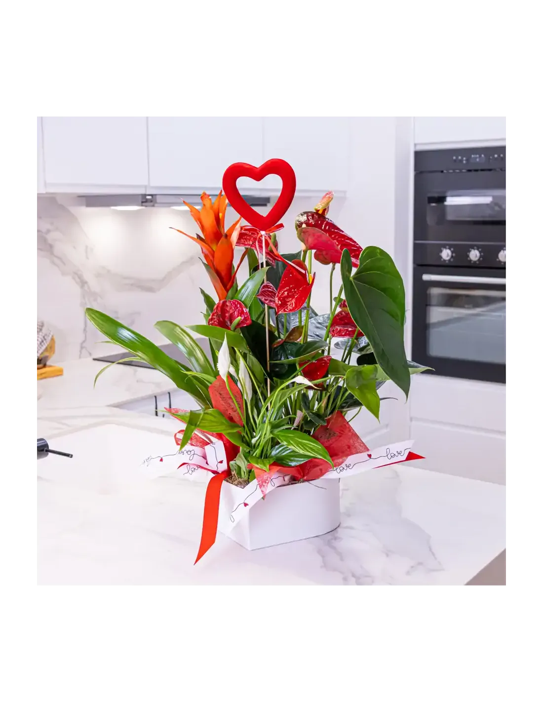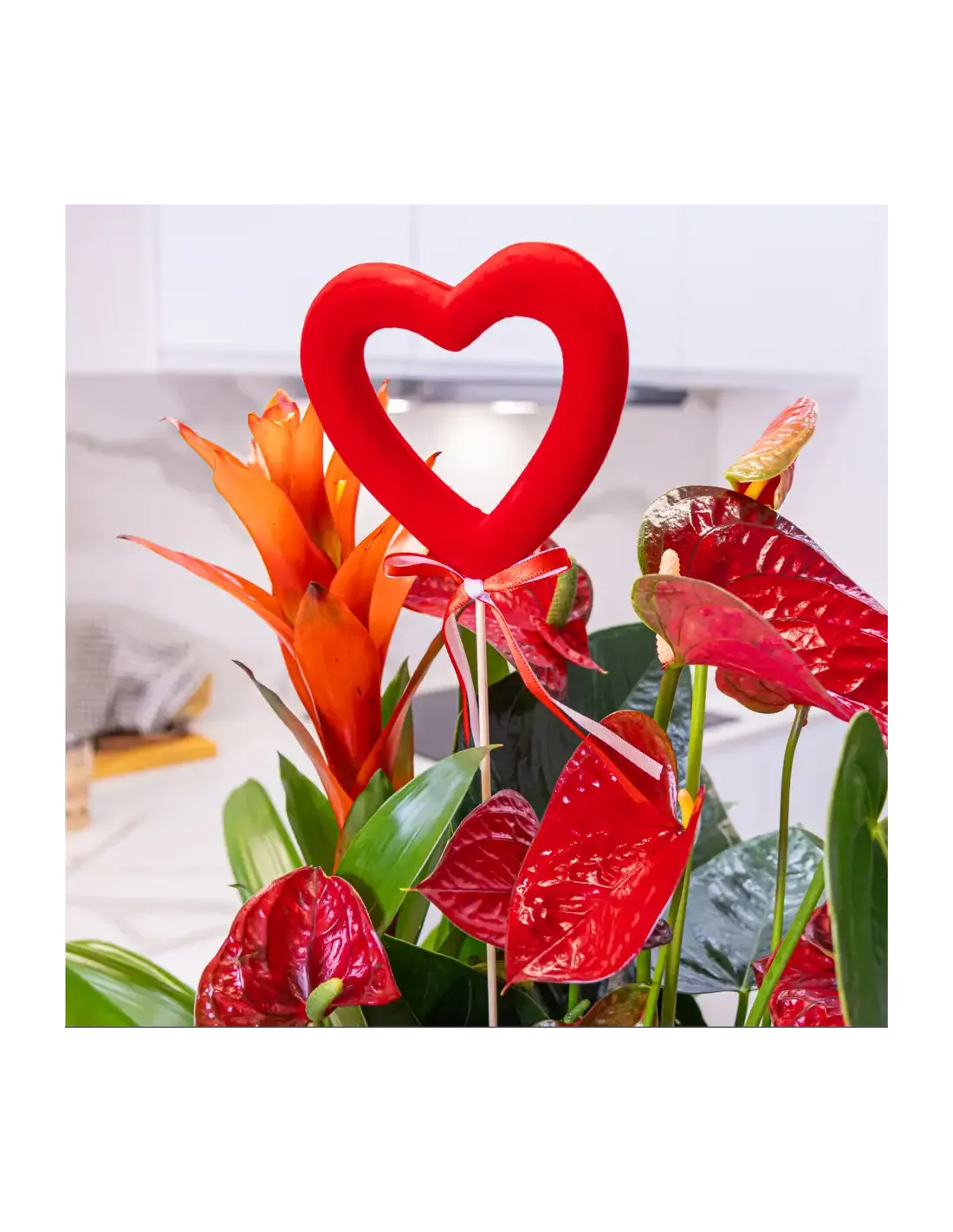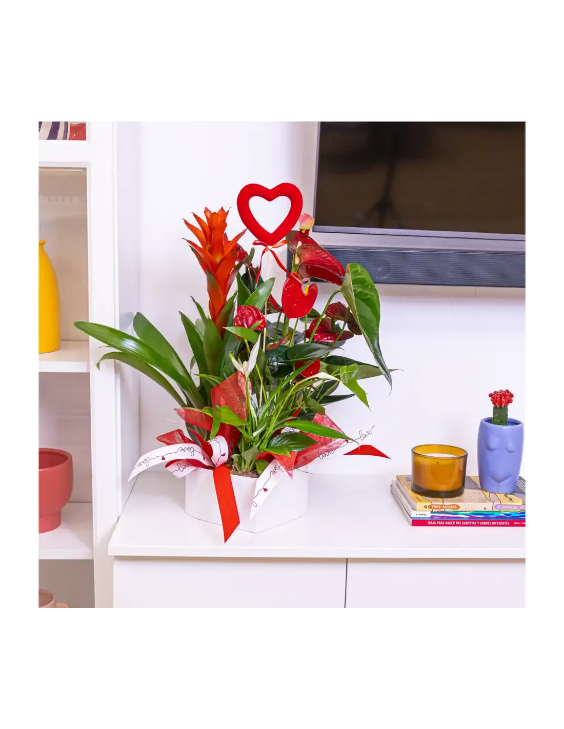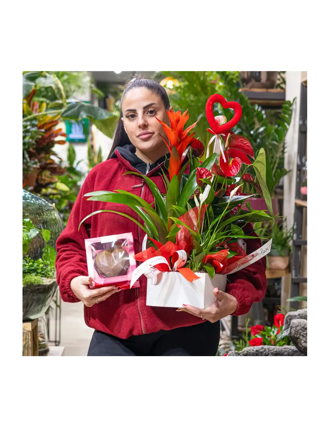 Un diseño único que combina la fuerza de las plantas exóticas con la delicadeza de una caja en forma de corazón. Este arreglo floral destaca por su frescura, elegancia y su mensaje de amor