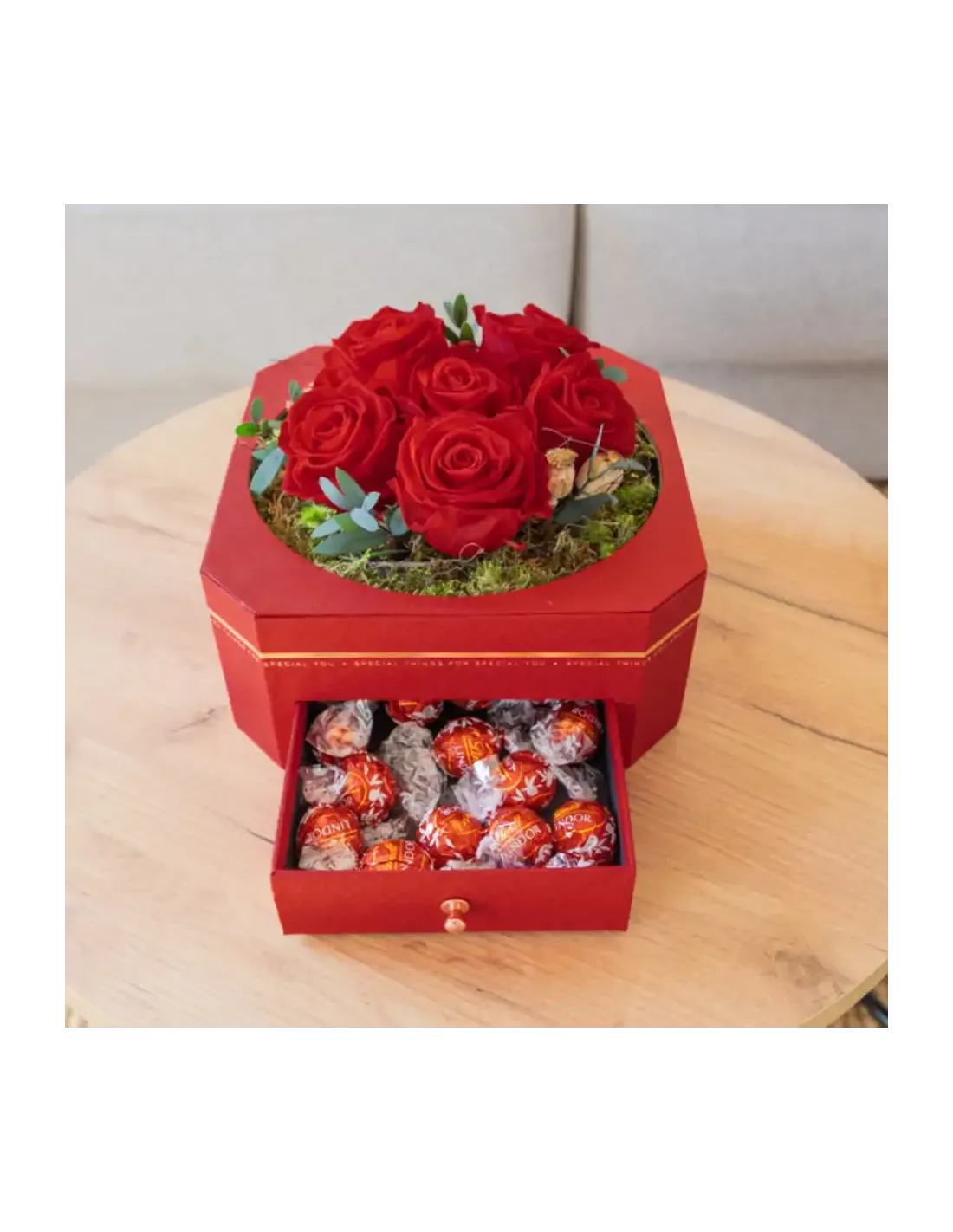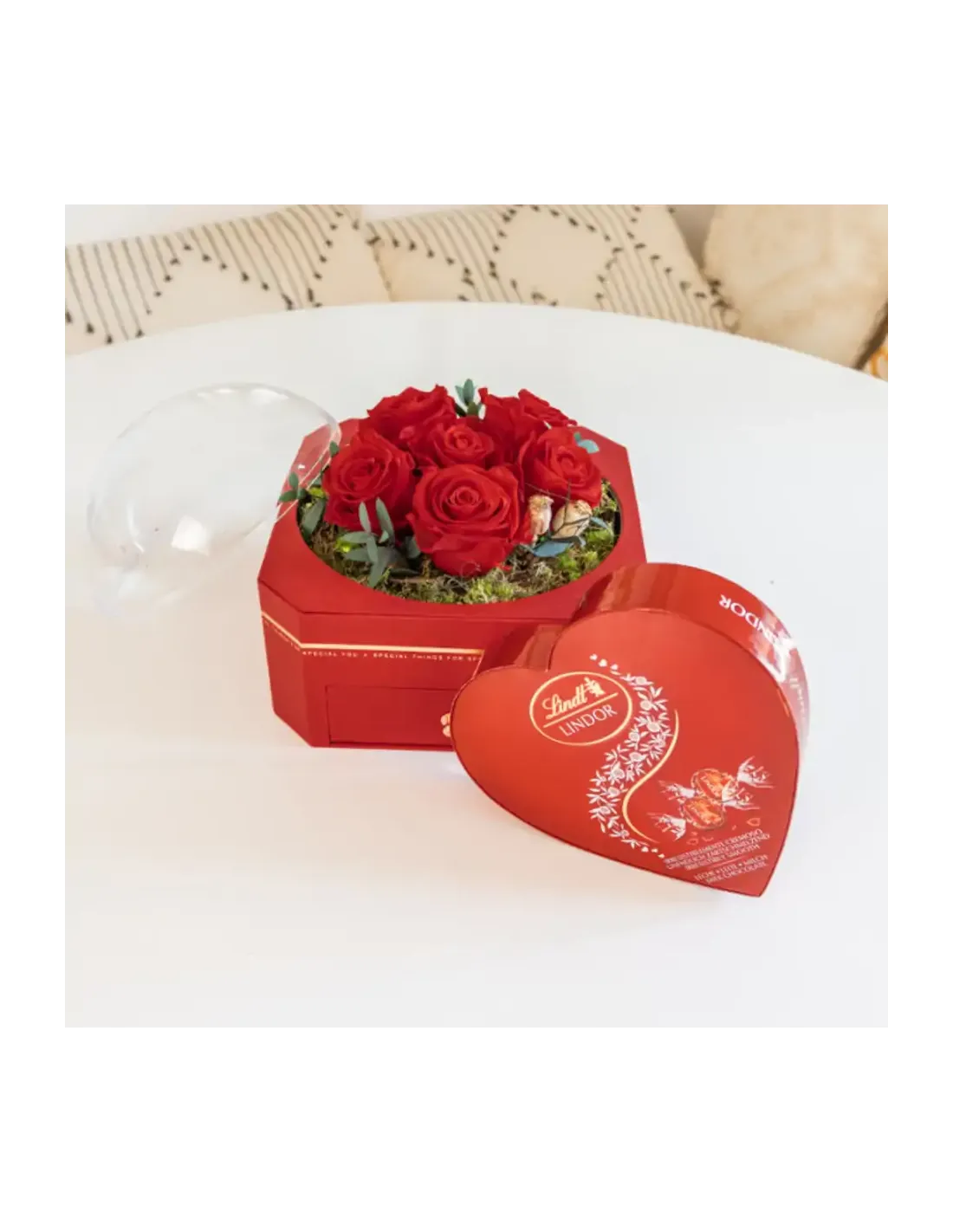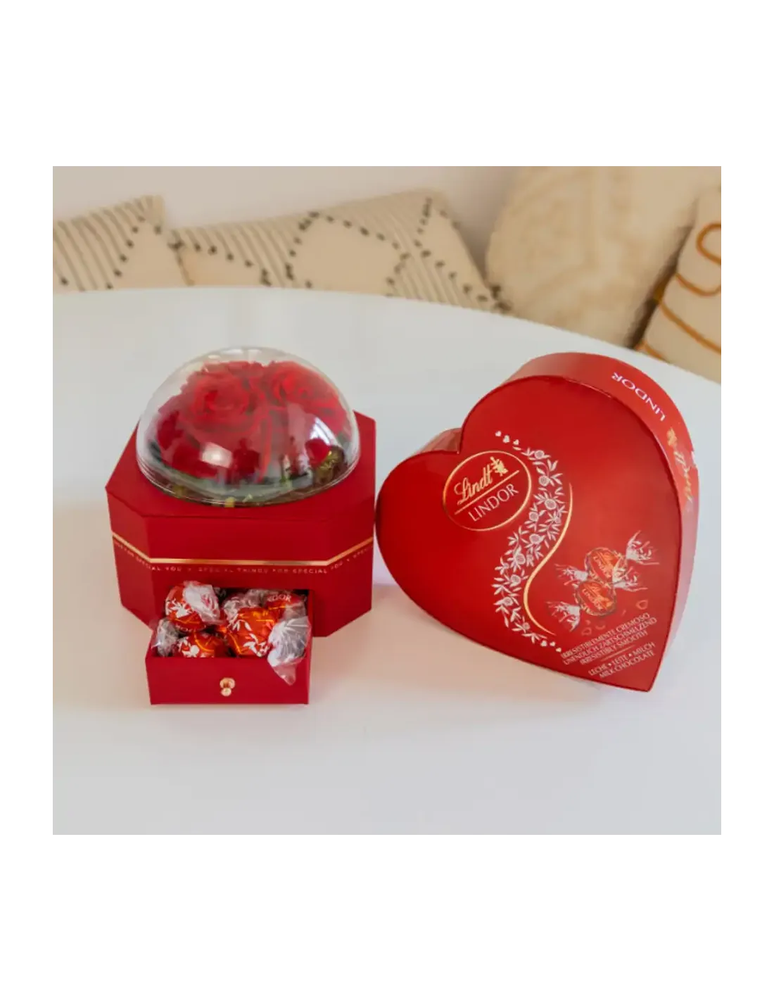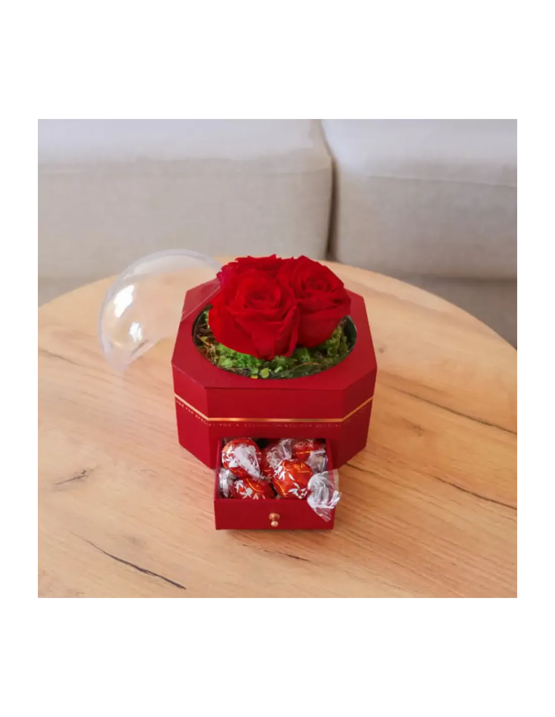 Caja de Amor Eterno con Dulce Sorpresa Déjate enamorar por nuestra cautivadora caja que fusiona la belleza eterna de las rosas preservadas con la delicia instantánea de exquisitas chocolatinas. Rosas Preservadas que cuentan la historia eterna de tu amor y un Cajoncito de Chocolatinas como sorpresa dulce para endulzar cada momento.¿Por qué solo regalar flores cuando puedes regalar toda una experiencia? Unidades limitadas .Haz tu pedido hoy y lleva el romance a un nivel más dulce.