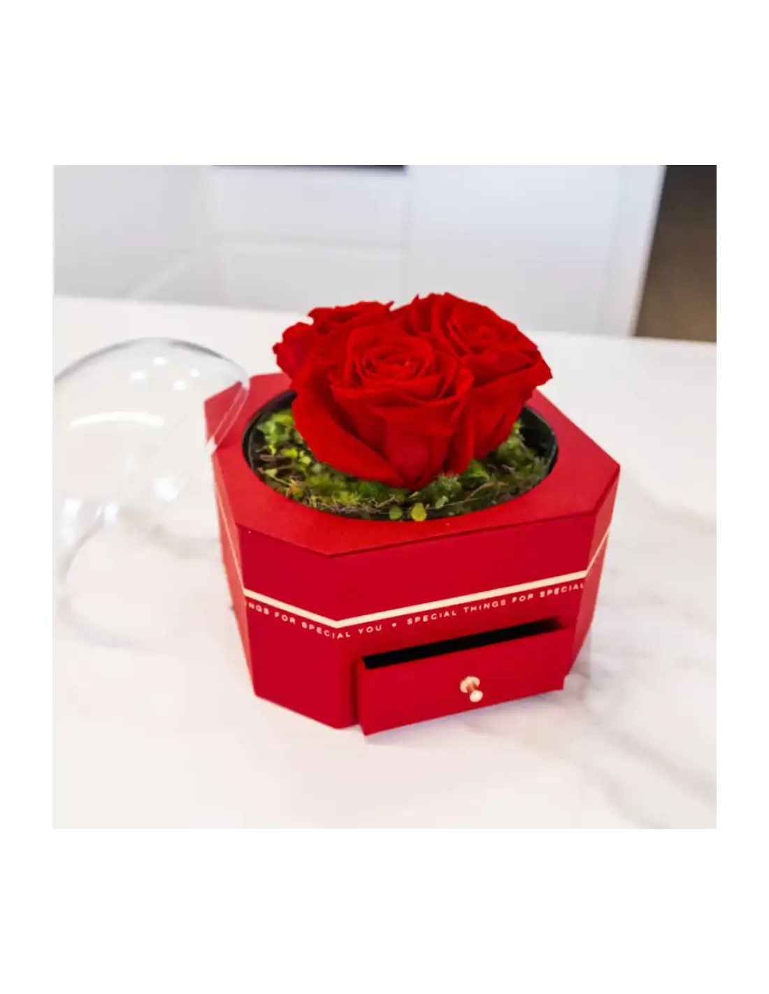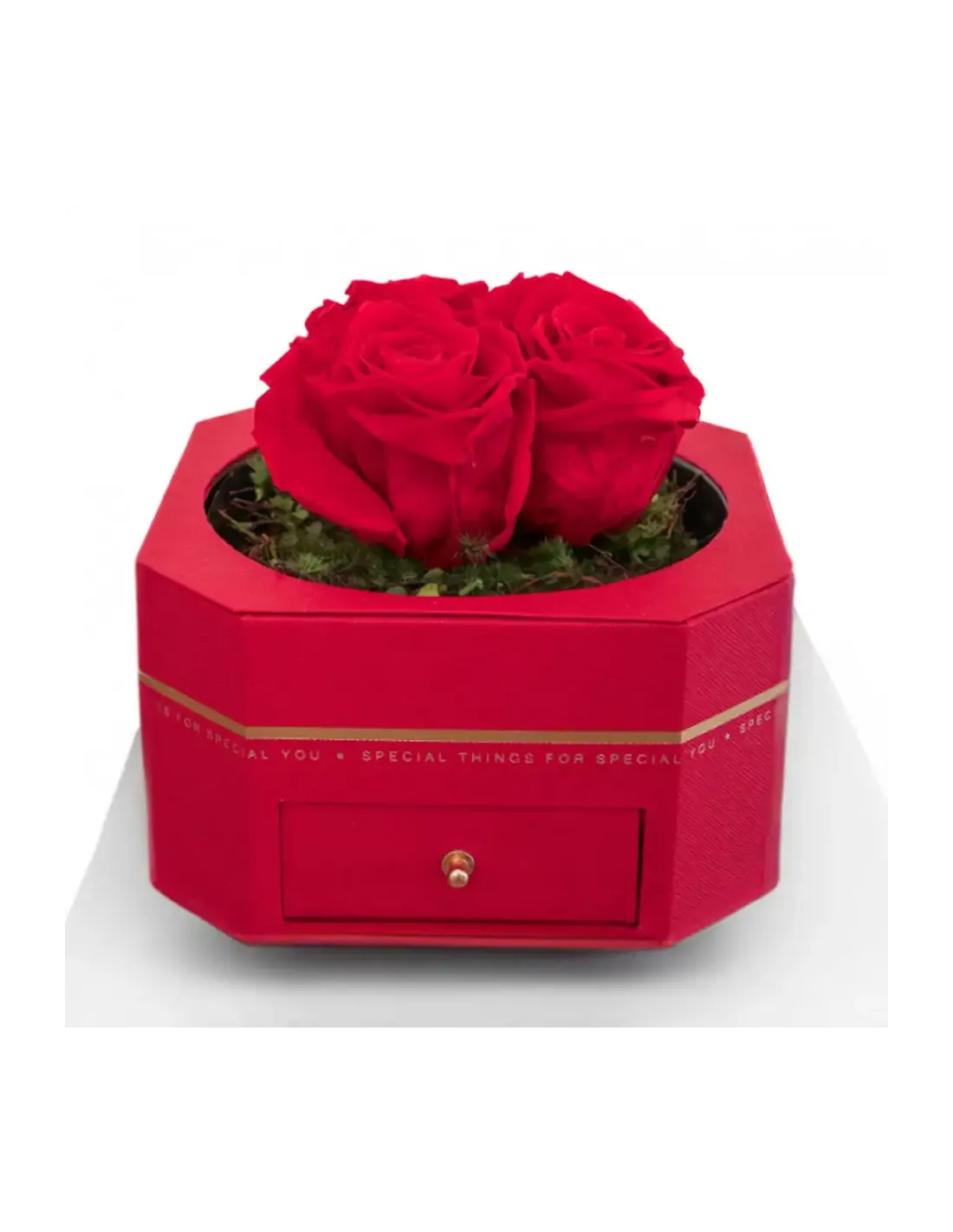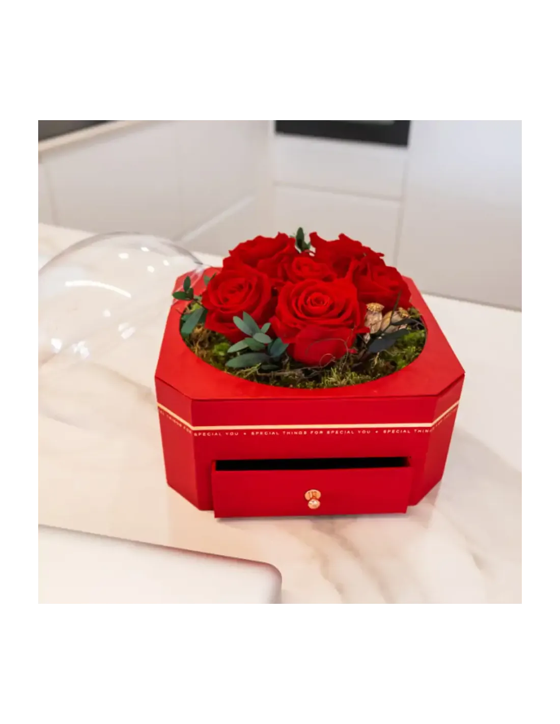 Caja de Amor Eterno con Dulce Sorpresa Déjate enamorar por nuestra cautivadora caja que fusiona la belleza eterna de las rosas preservadas con la delicia instantánea de exquisitas chocolatinas. Rosas Preservadas que cuentan la historia eterna de tu amor y un Cajoncito de Chocolatinas como sorpresa dulce para endulzar cada momento.¿Por qué solo regalar flores cuando puedes regalar toda una experiencia? Unidades limitadas .Haz tu pedido hoy y lleva el romance a un nivel más dulce.
