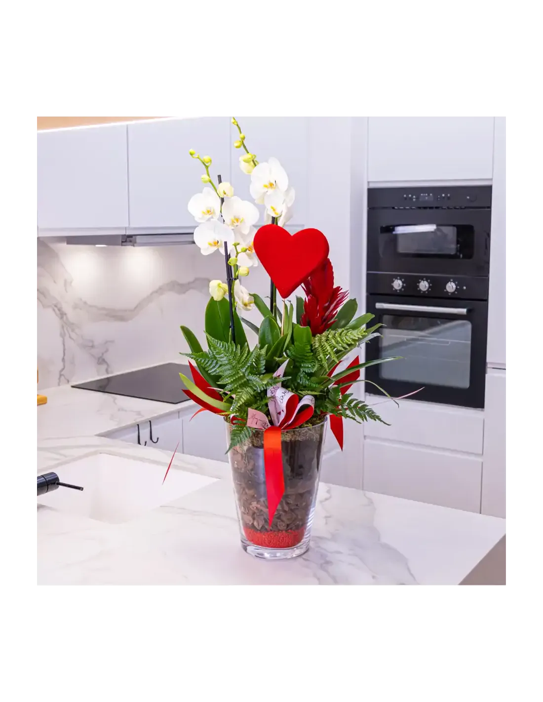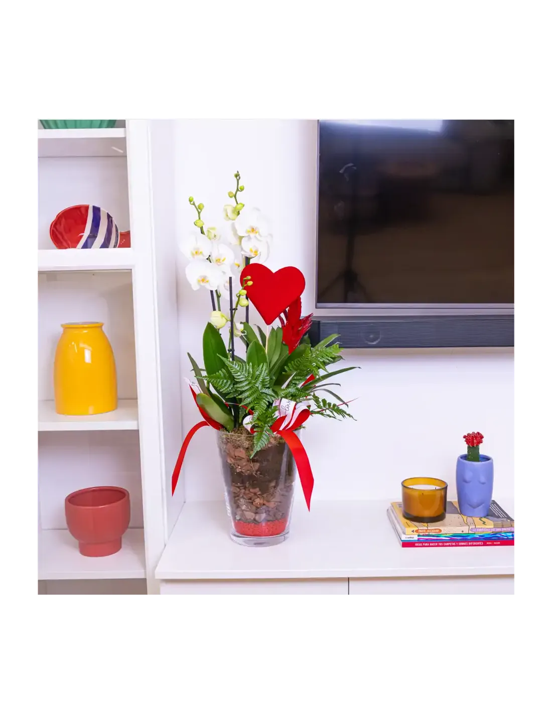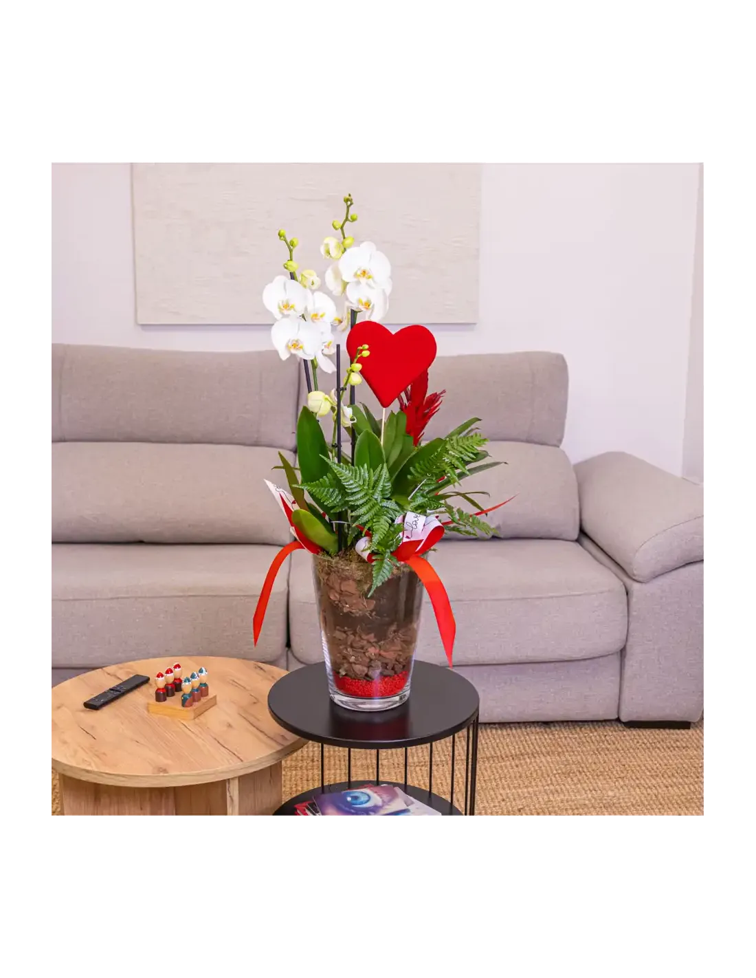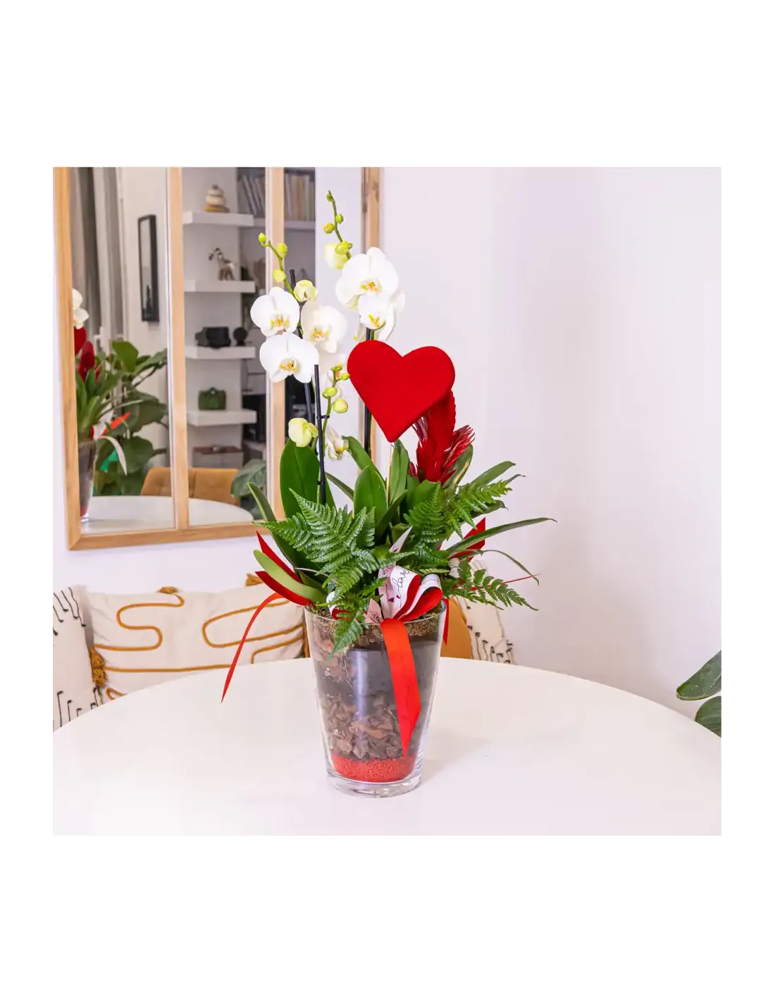 Un diseño floral único que combina la pureza de la phalaenopsis blanca, el vibrante color rojo de la vriesia y la frescura natural del helecho, todo enmarcado en un elegante cilindro de cristal. Esta composición es perfecta para transmitir emociones intensas y decorar con sofisticación cualquier espacio.