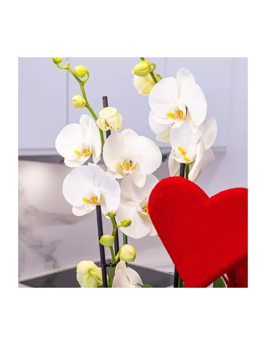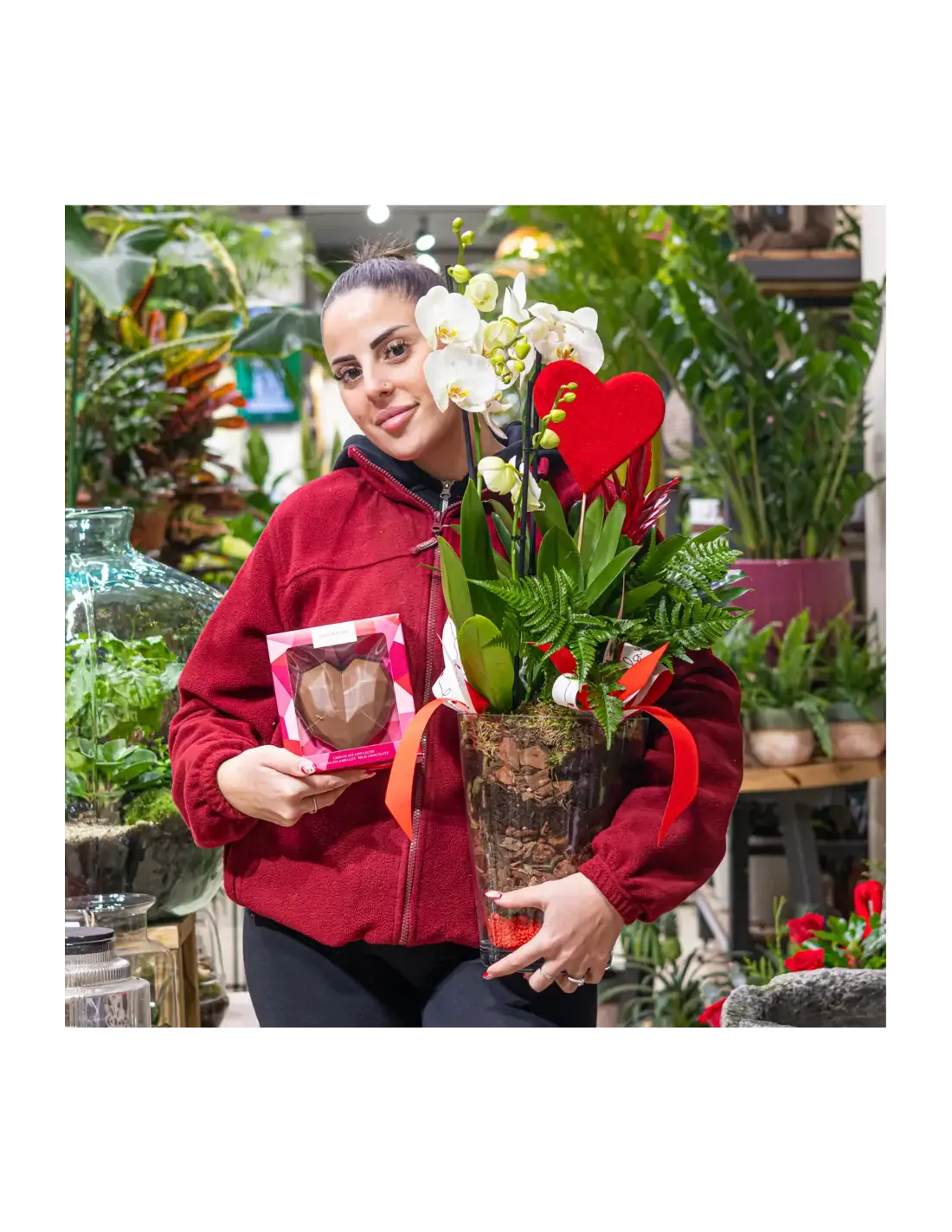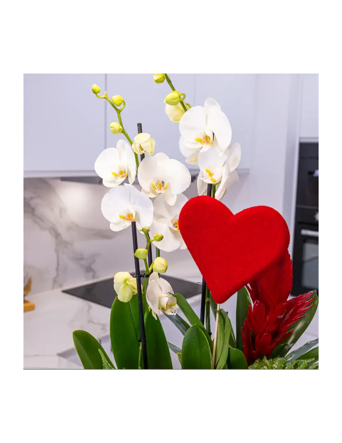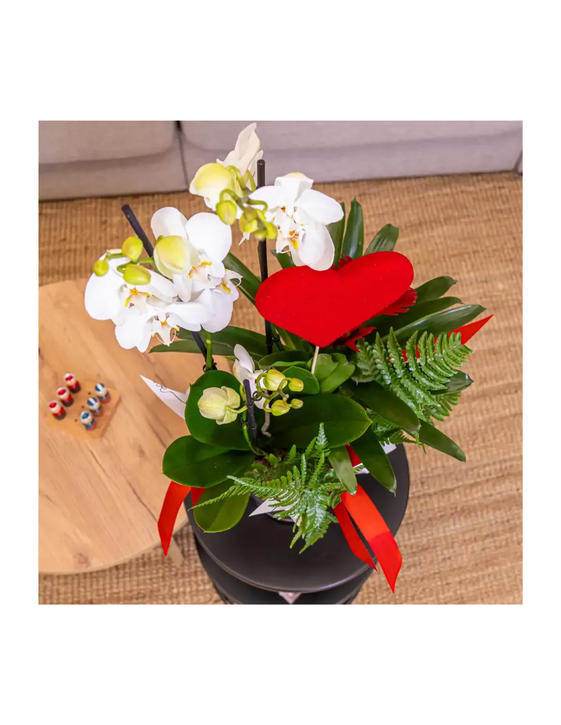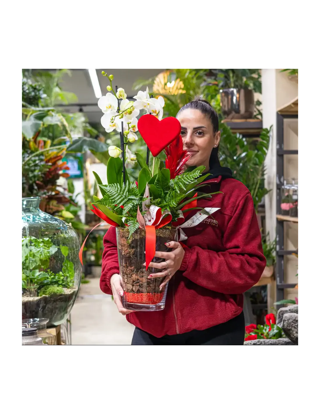 Un diseño floral único que combina la pureza de la phalaenopsis blanca, el vibrante color rojo de la vriesia y la frescura natural del helecho, todo enmarcado en un elegante cilindro de cristal. Esta composición es perfecta para transmitir emociones intensas y decorar con sofisticación cualquier espacio.