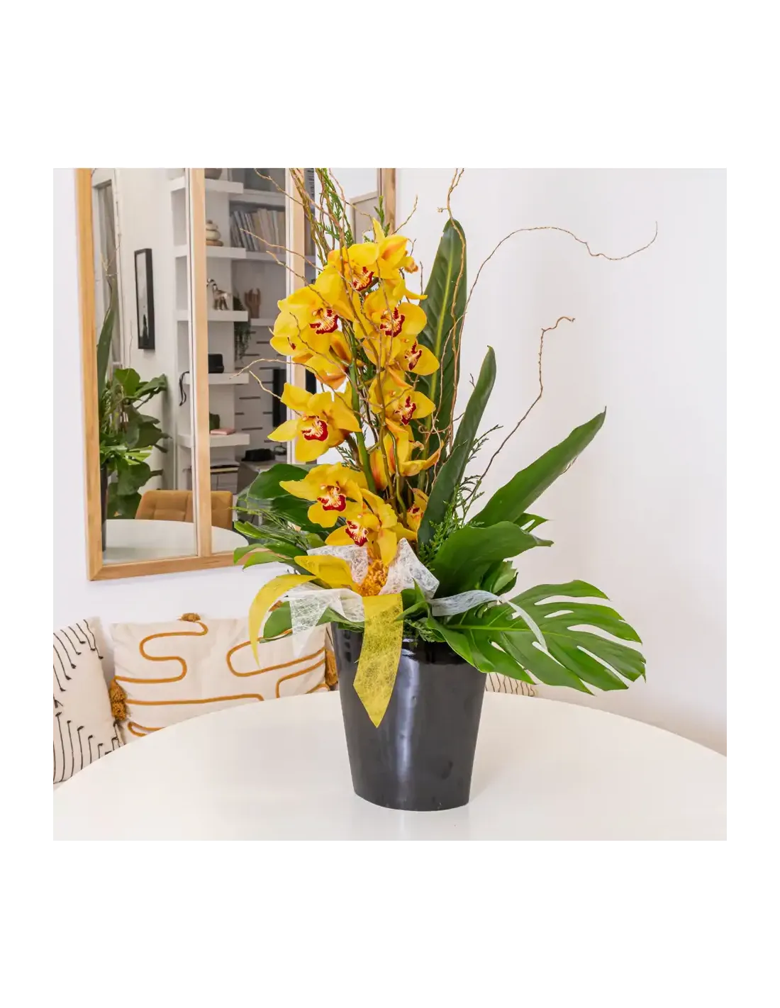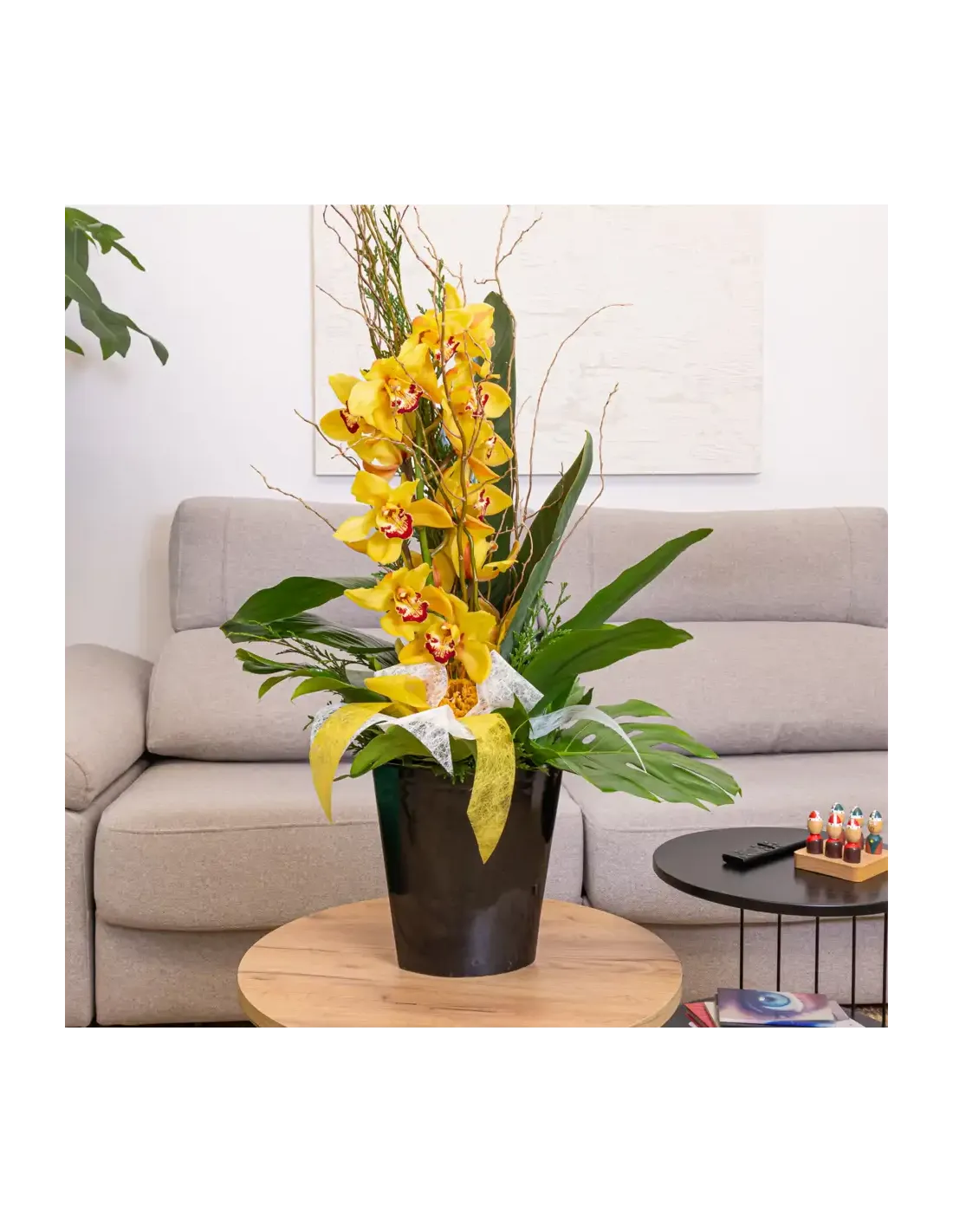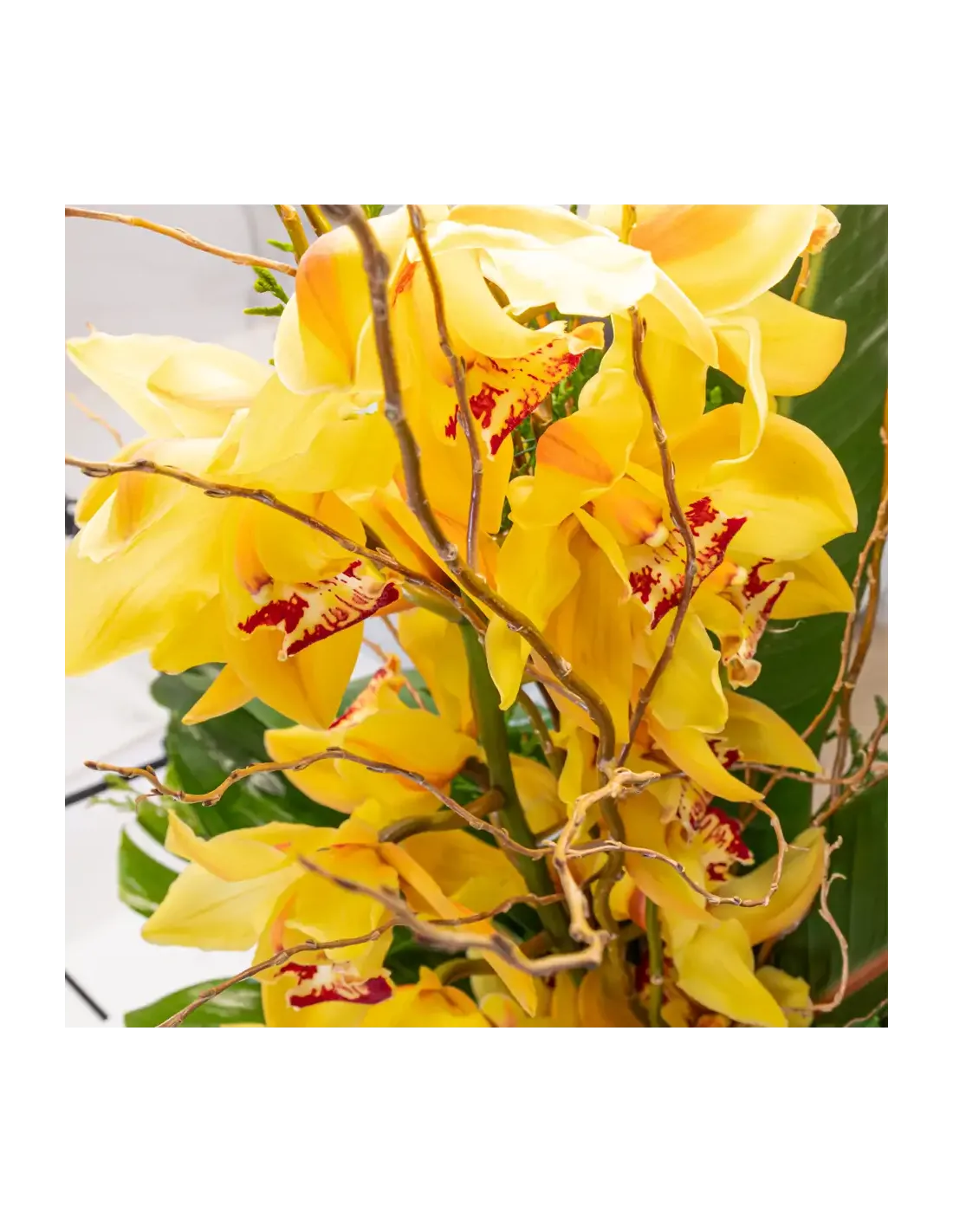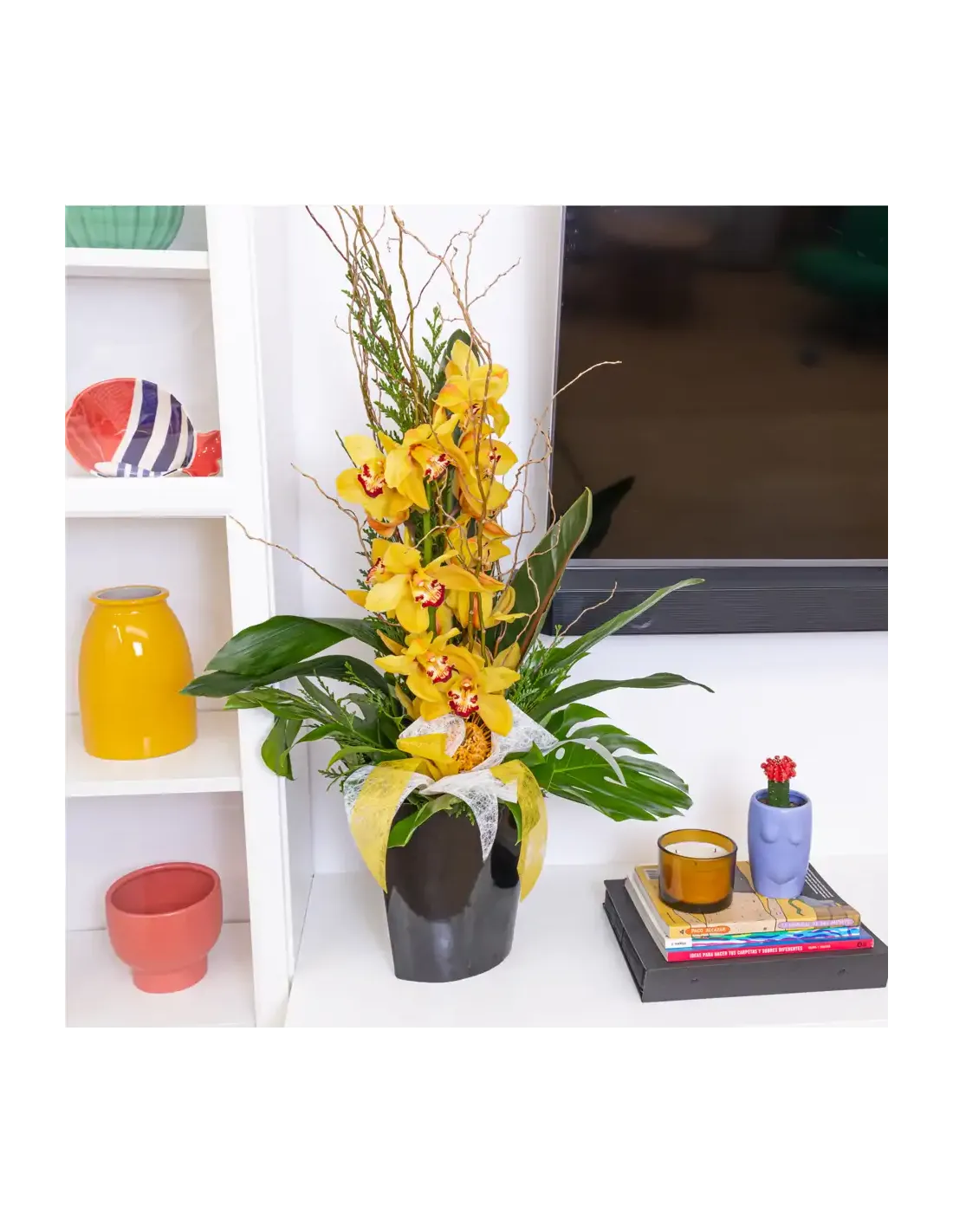 Déjate cautivar por la elegancia de la orquídea cymbidium en este diseño vertical que destaca por su sencillez y sofisticación. Disponible en varios colores para adaptarse a cualquier ambiente, este arreglo es perfecto para dar un aire moderno y refinado a hogares y oficinas