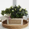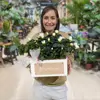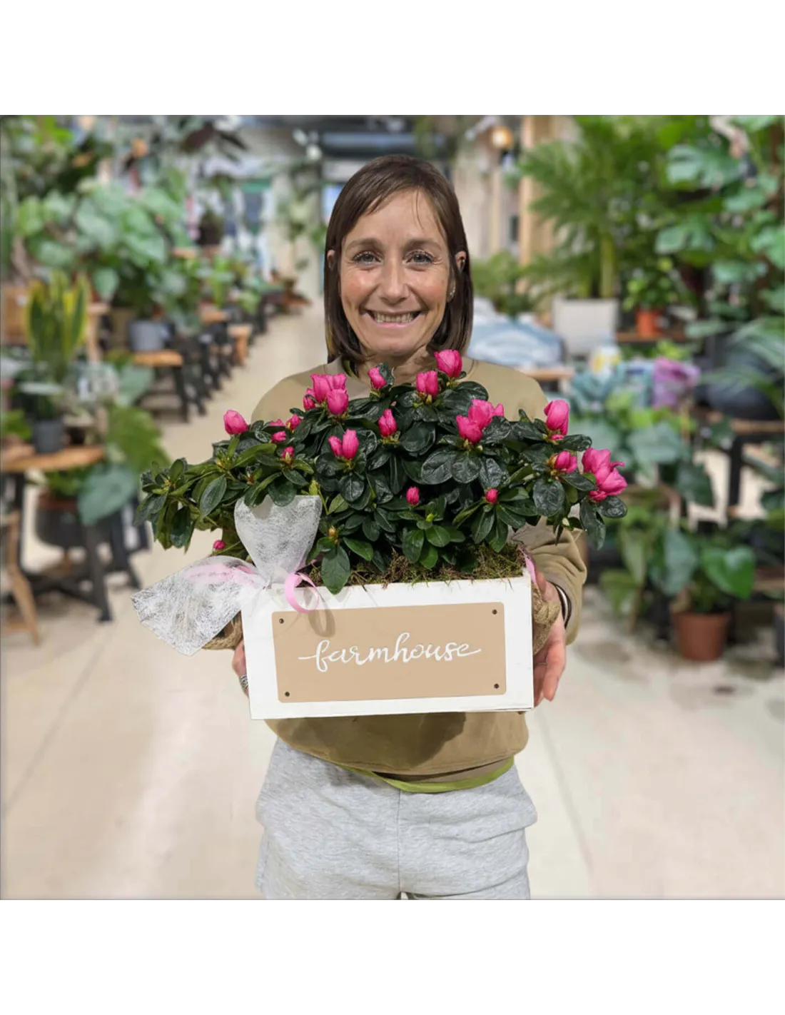Delicada y con un aire romántico, esta composición de azaleas blancas en caja farmhouse aporta luz y serenidad a cualquier espacio. Sus flores, suaves y abundantes, contrastan con el verde intenso del follaje y el estilo natural de la base de madera. Perfecta para interiores luminosos o para sorprender con un regalo diferente en Barcelona. Las azaleas florecen durante semanas y no requieren grandes cuidados: belleza pura con muy poco esfuerzo.