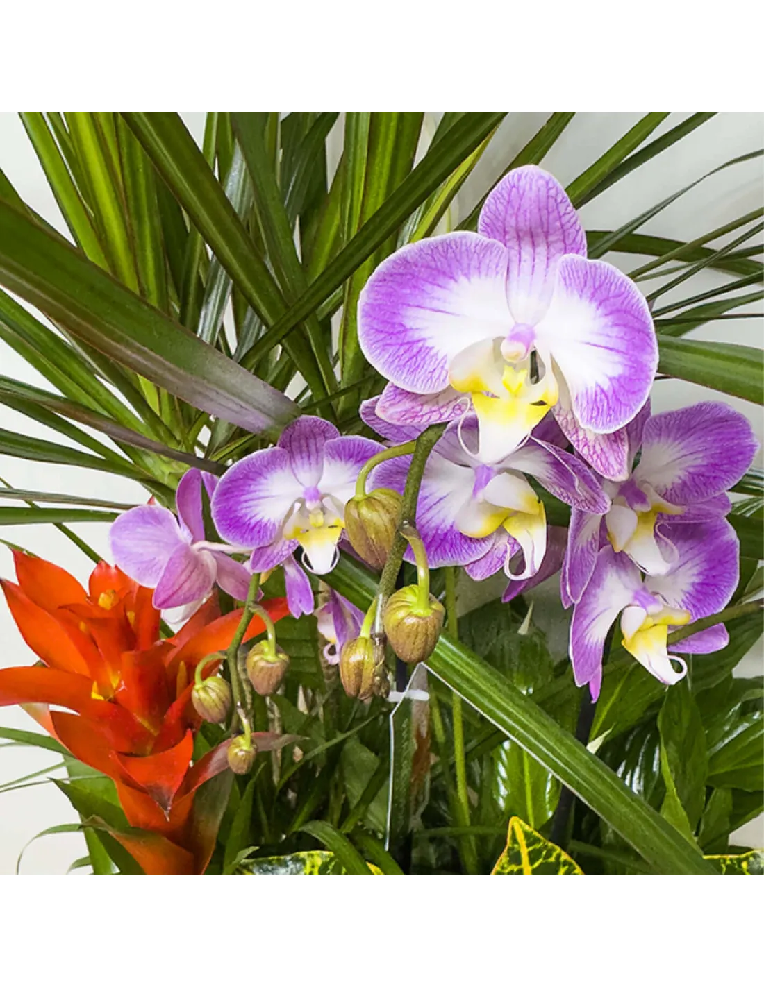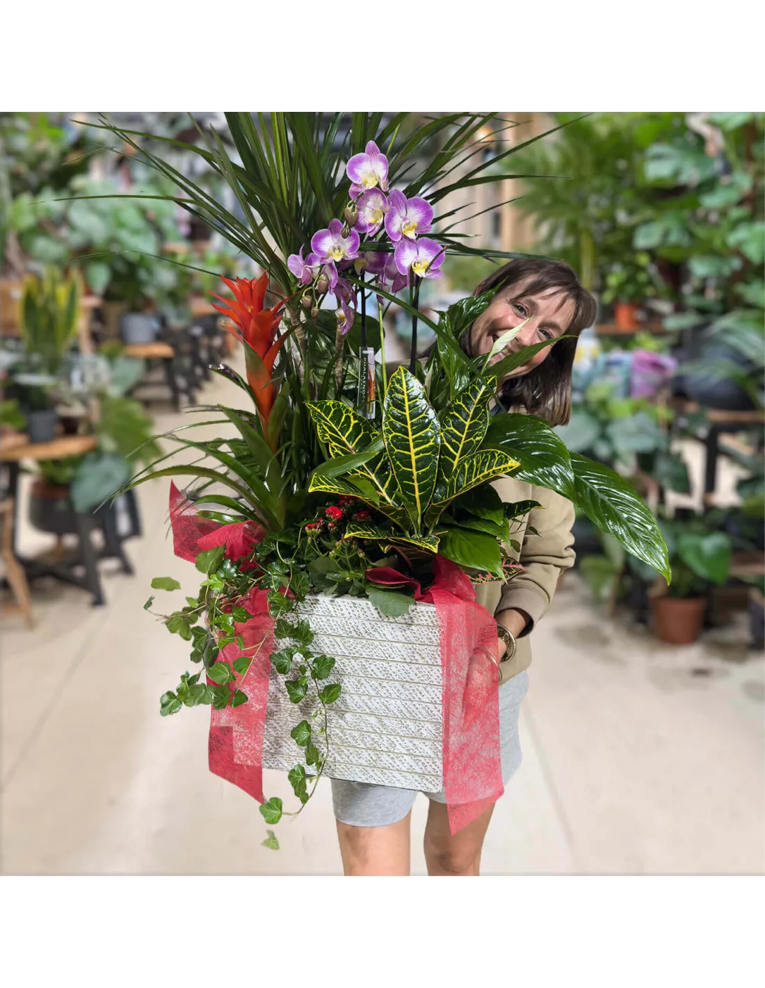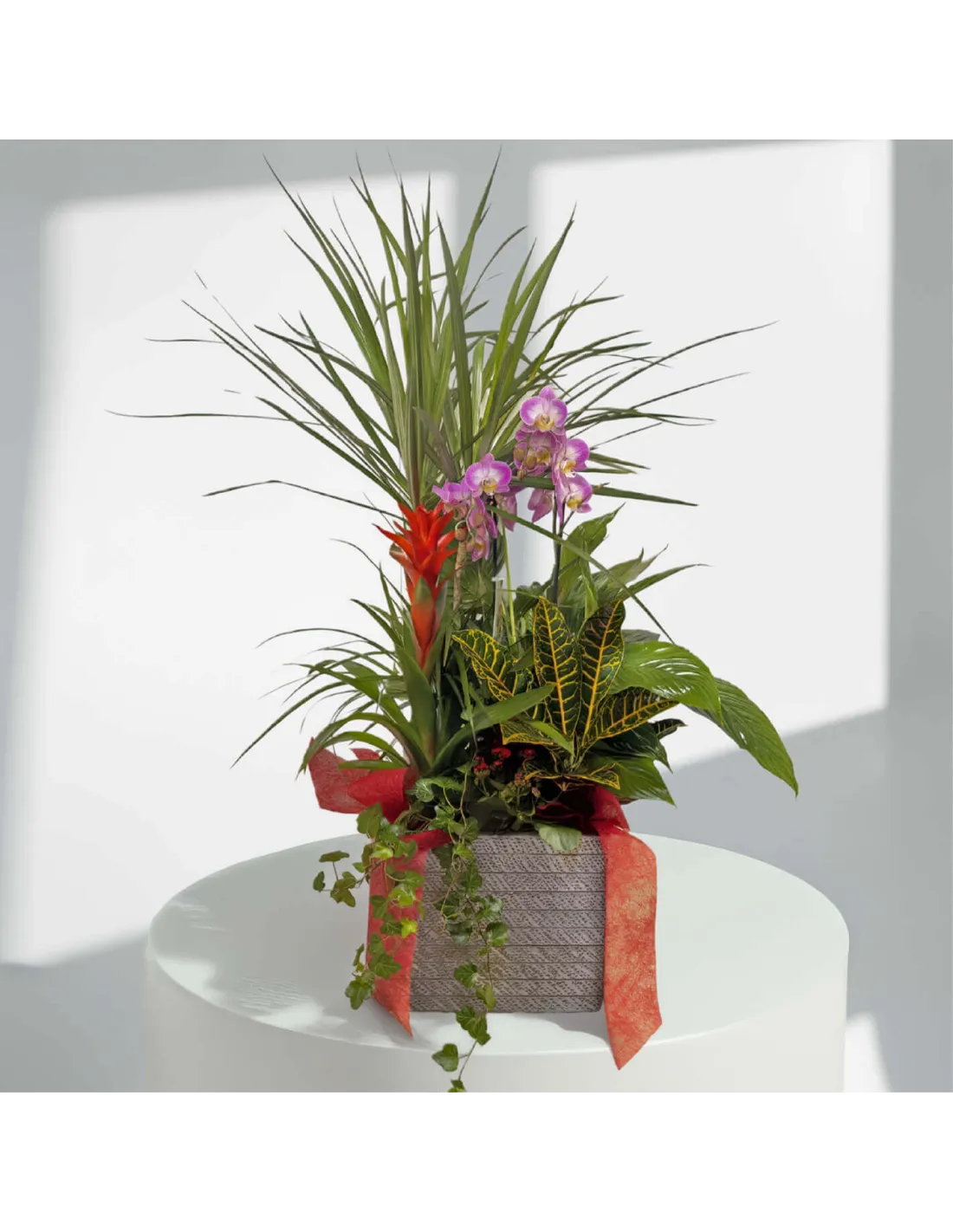 Una composición vegetal sofisticada que combina elegancia, color y volumen. Esta selección premium incluye drácena marginata, guzmania, phalaenopsis, crotón, kalanchoe e hiedra, creando un conjunto armonioso y exuberante. Pensada para quienes quieren impactar con un regalo único o decorar con estilo entradas, oficinas o salones amplios. Cada planta aporta textura y personalidad, formando un oasis verde de fácil mantenimiento y gran belleza visual.