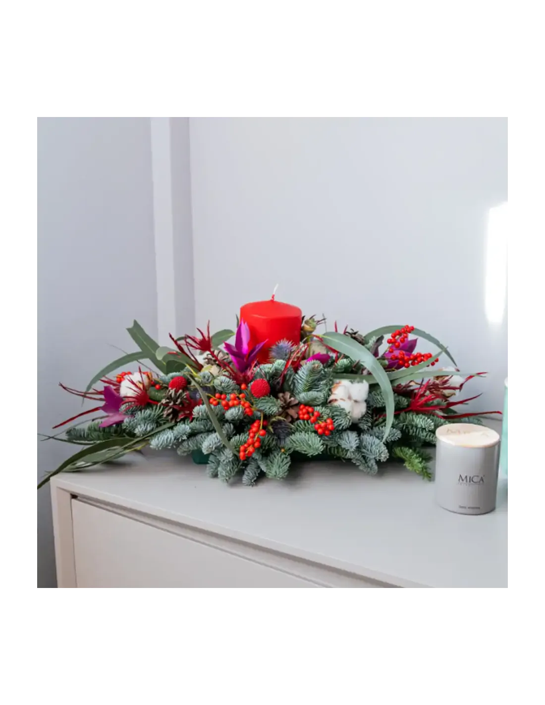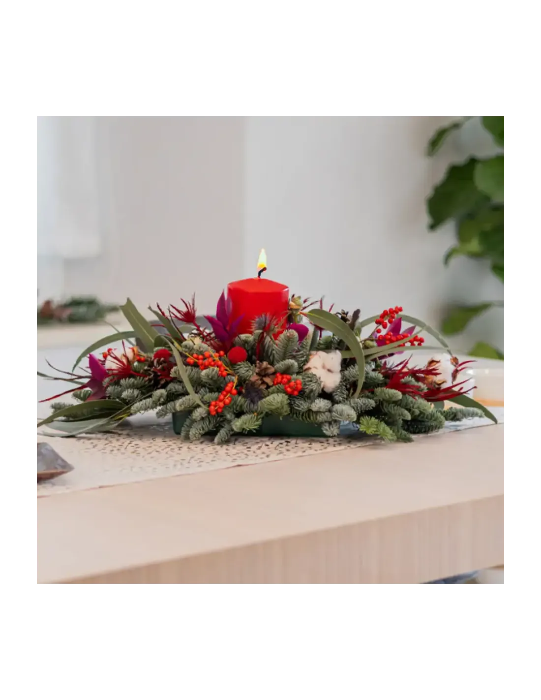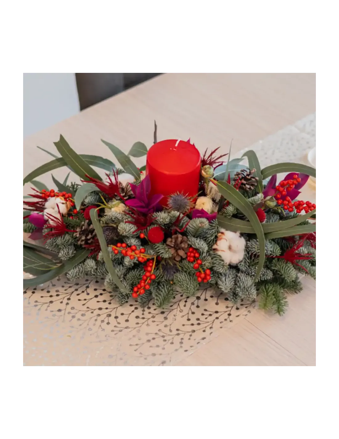 Una fusión armoniosa de elementos naturales es nuestro Centro de Mesa Alargado compuesto por delicadas flores de algodón, pequeñas ramas de ilex, tallos de eucalipto bola, craspedias rojas, ramas de abeto, piñas pequeñas, tallos de erengium y tallos de ruscus lila se entrelazan para crear un refugio invernal en tu mesa.Un bonito centro de mesa navideño en donde los tonos verdes se destacan elegantemente alrededor de una vela brillante, mientras que las craspedias rojas añaden un toque cálido y acogedor al ambiente. Te invitamos a sumergirte en la magia de la temporada con encanto y festividad.
