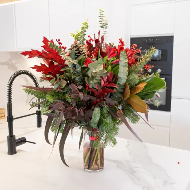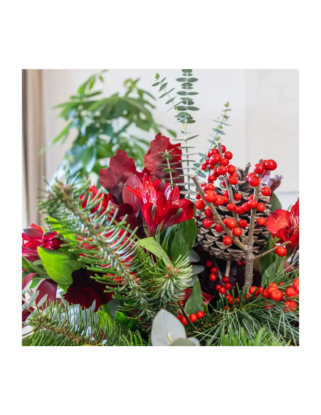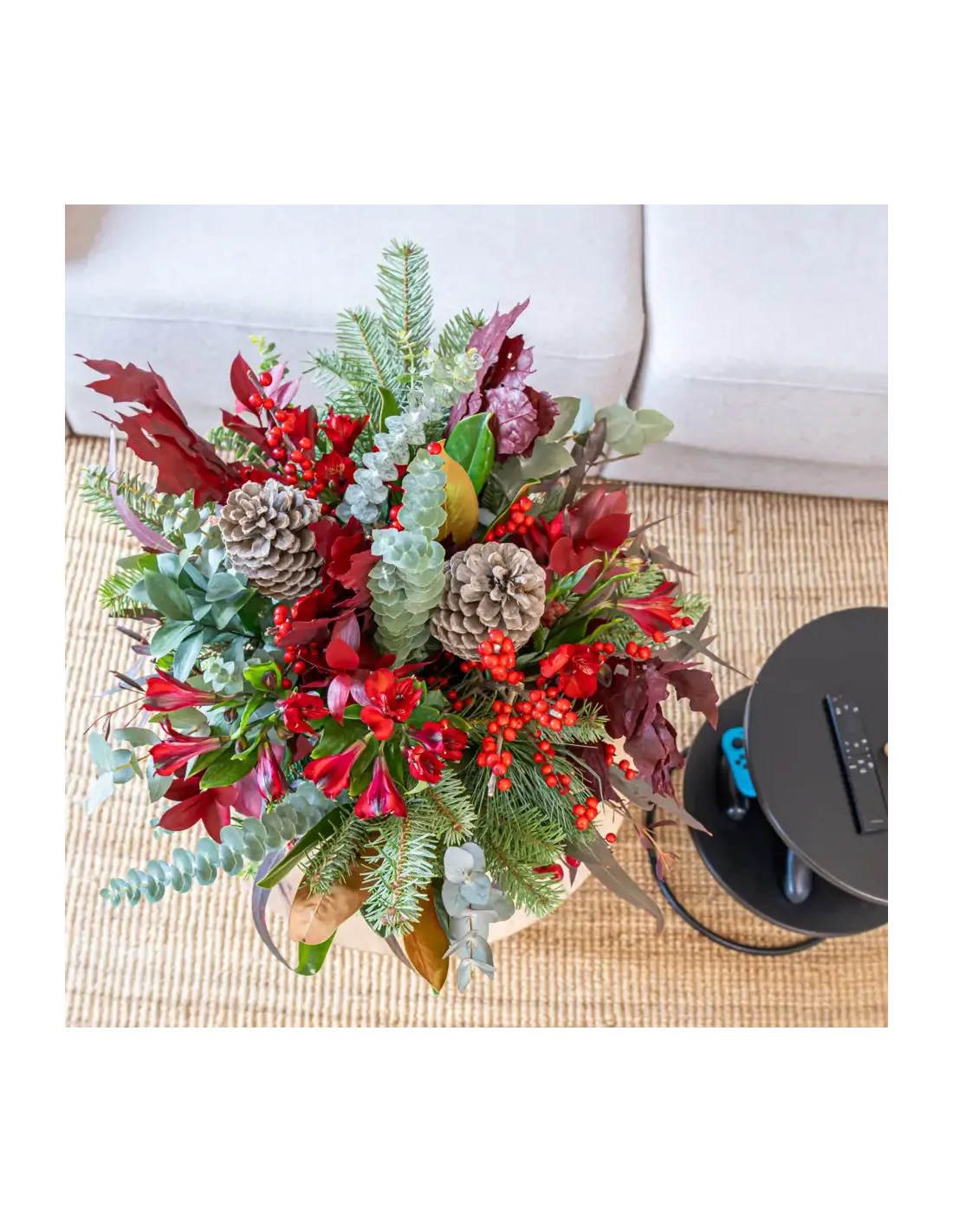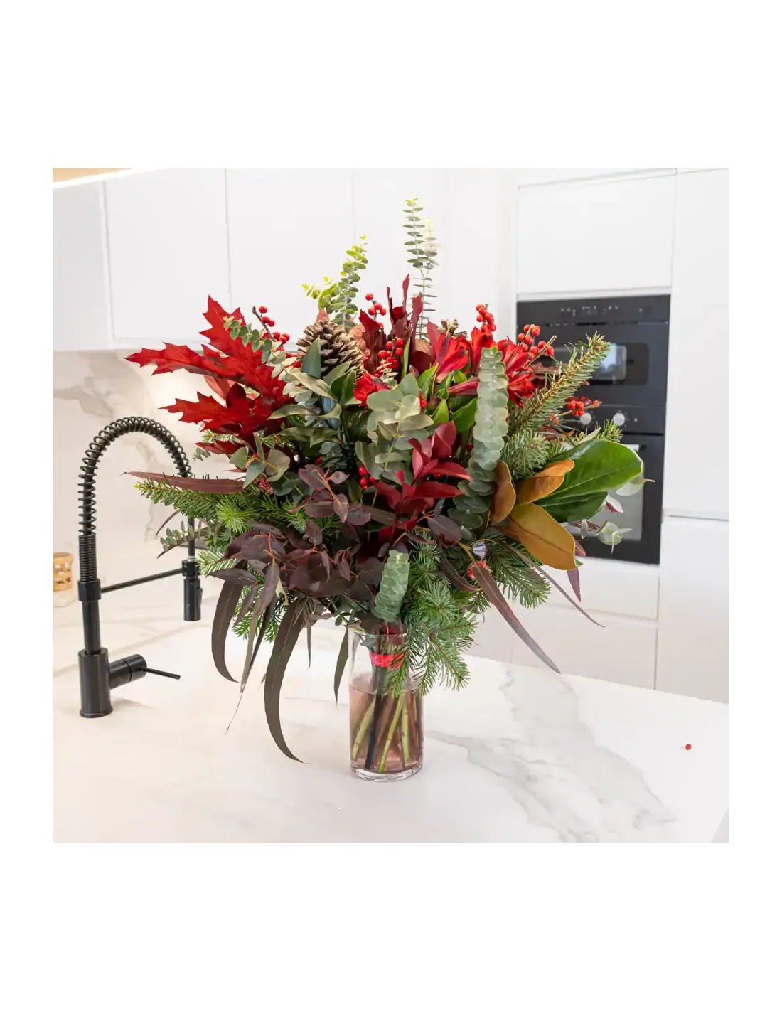 Transforma tu hogar con la magia del bosque en Navidad. Este arreglo combina tonos cálidos de hojas otoñales, elegantes ramas de eucalipto, frutos rojos brillantes y detalles naturales como piñas decorativas. Su diseño exuberante y elegante es ideal para realzar cualquier rincón de tu hogar o para regalar un toque de naturaleza navideña a alguien especial.