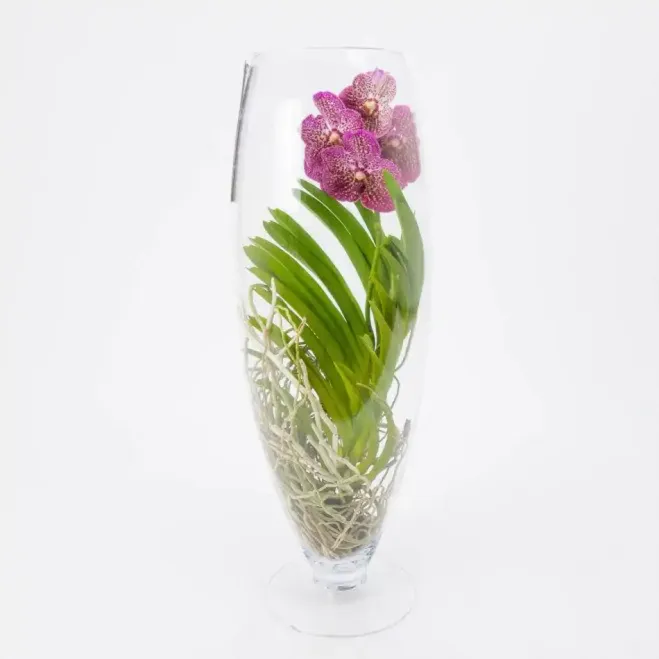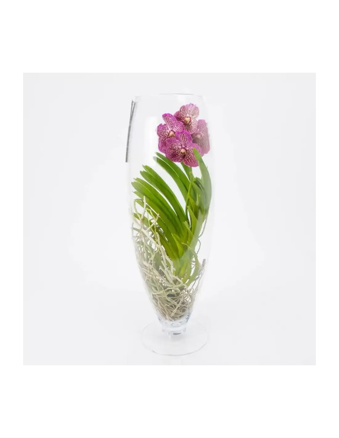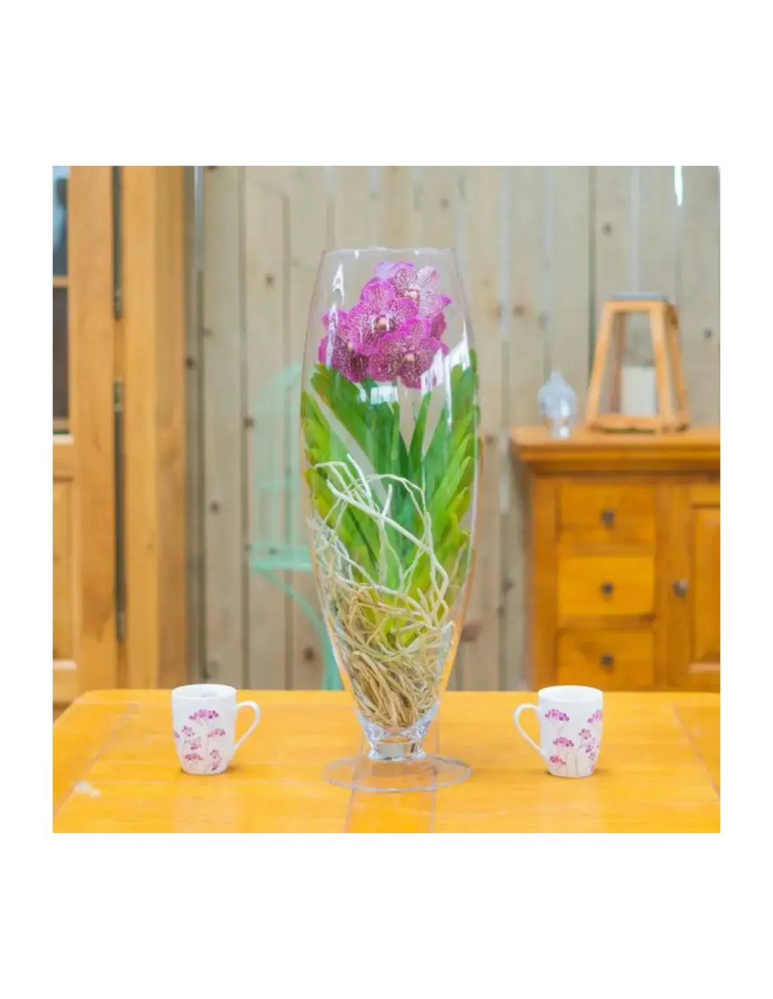 Tiesto incluido. ¿Esta Orquídea es de verdad? Sí, lo es, es natural. Nuestra Orquídea Wanda vive en un jarrón sin agua y sin tierra, es aérea. Los cuidados de la Wanda son un poquito más exigentes que los de otras orquídeas. Necesitan entre un 70 - 80% de humedad en el ambiente, para conseguirlo pulveriza con agua sus raíces de manera habitual. Para regarla, sumerge sus raíces en un cubo con agua al menos una vez a la semana. Si sus raíces están muy blancas es que tiene sed.