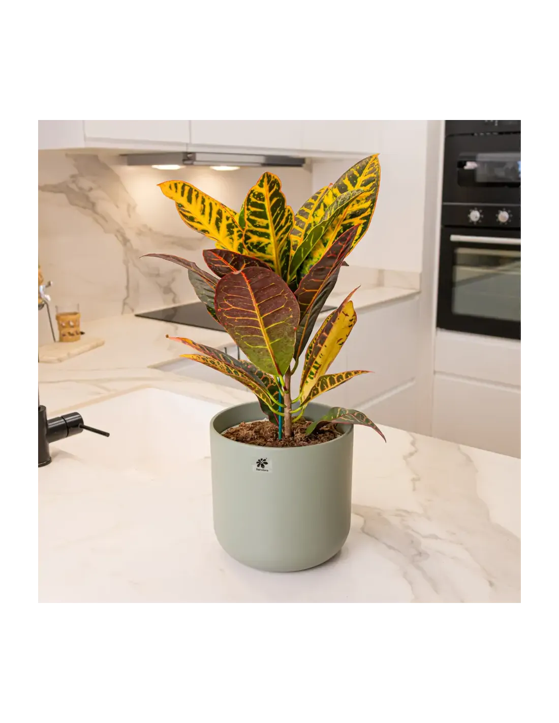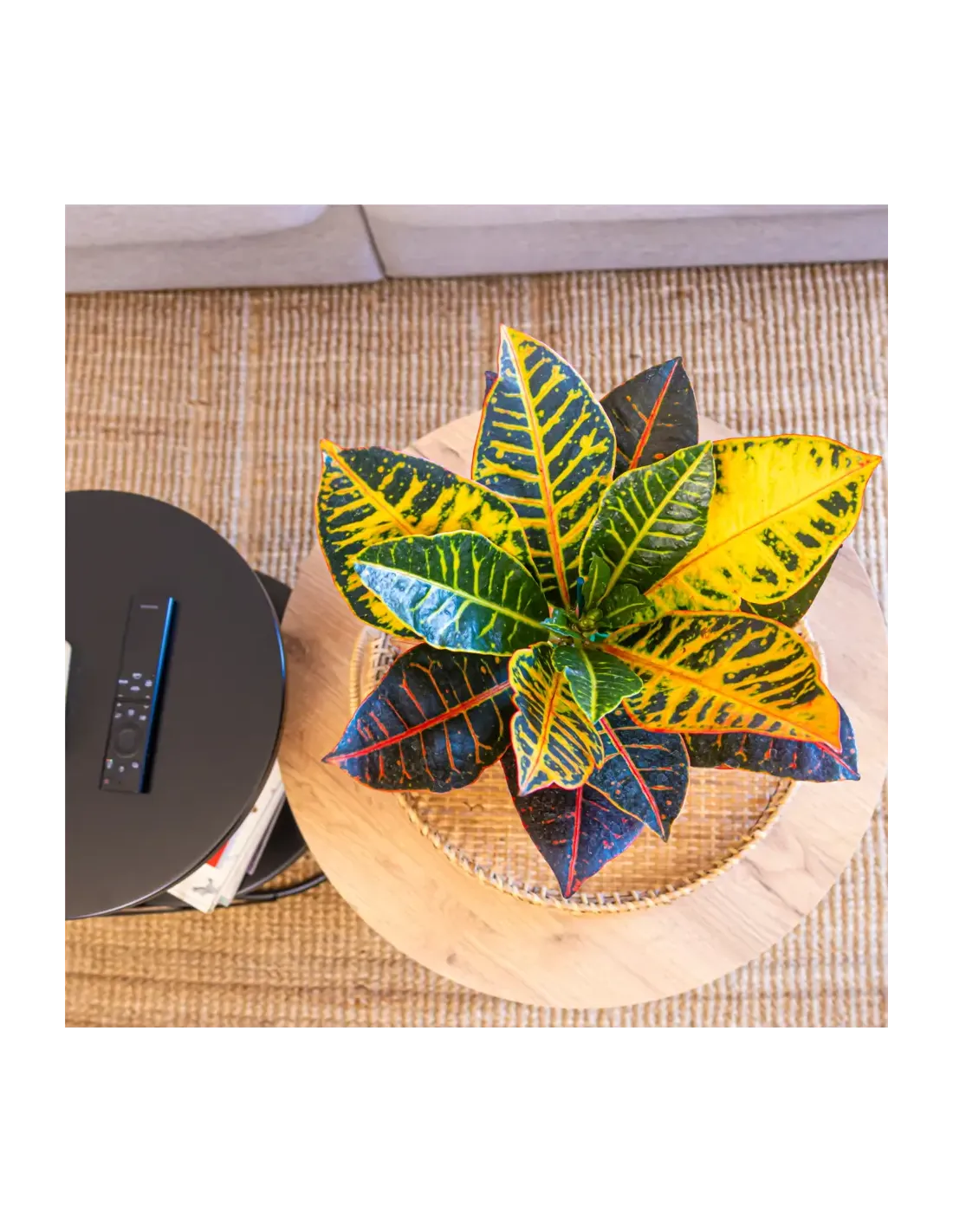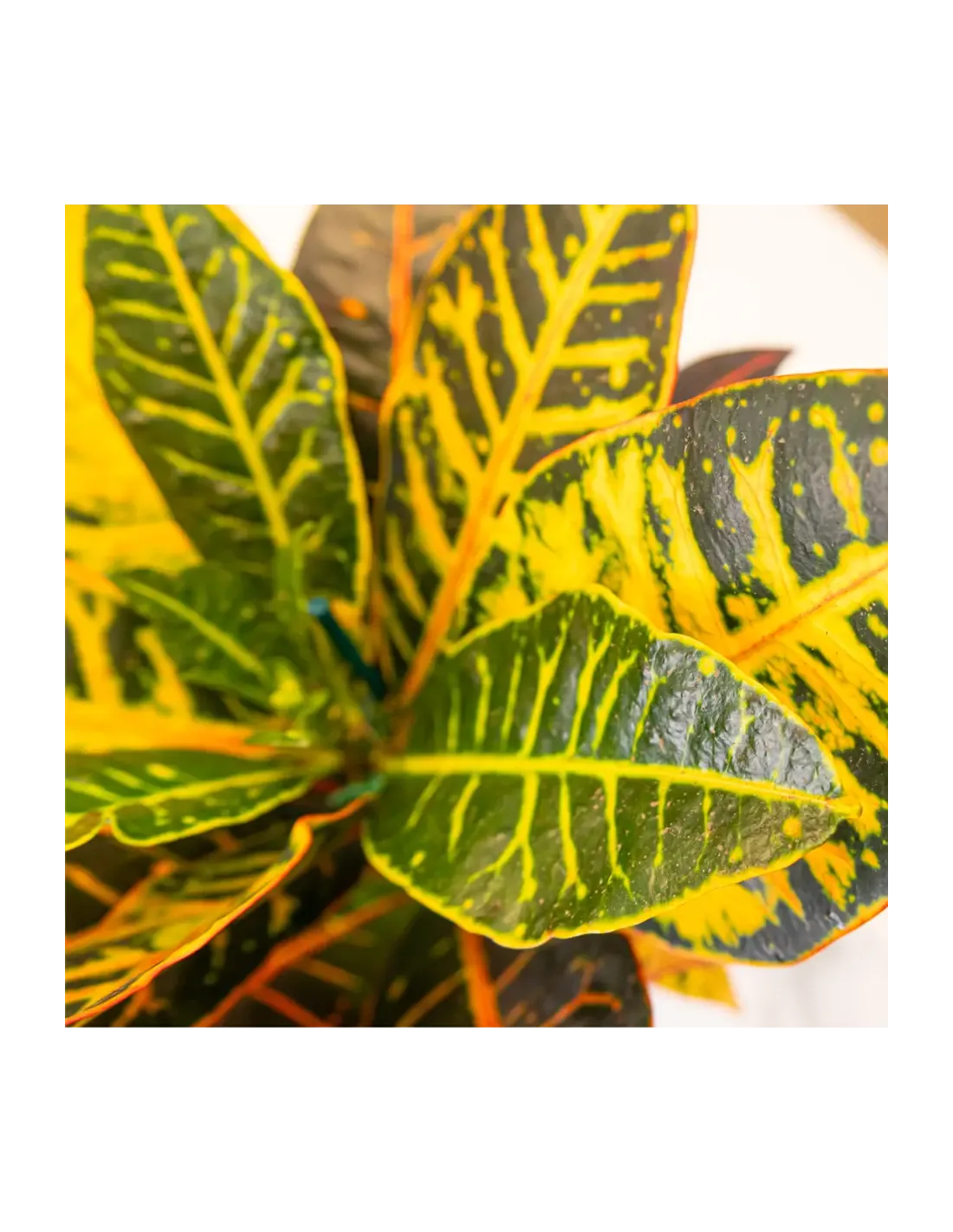 Planta de interior que posee la mayor gama de colores vivos en sus hojas. Sus hojas son duras y con nervaduras que van desde el amarillo hasta el rojizo. (Tiesto no incluido) Dentro de los Crotons existen muchas variedades de diferntes formas y colores en sus hojas. Puede alcanzar los 90 cm de alto. Los colores verdes, amarillos, naranjas y rojos se combinan en sus hojas. Si observamos que es originaria de las islas del Pacífico, marca mucho los cuidados de estas planta: la demanda de humedad.
