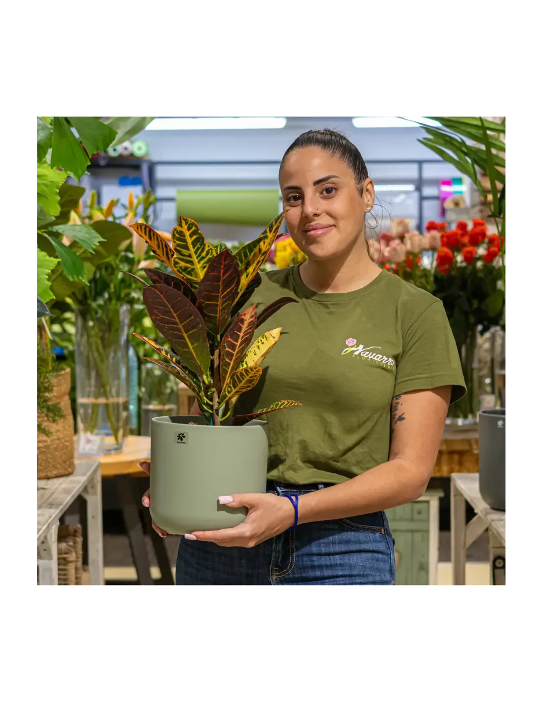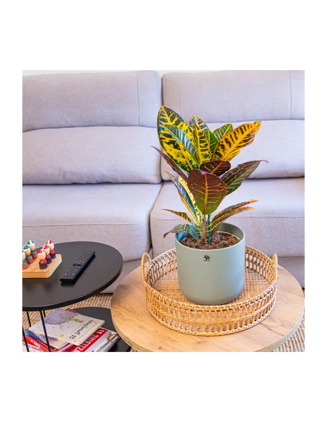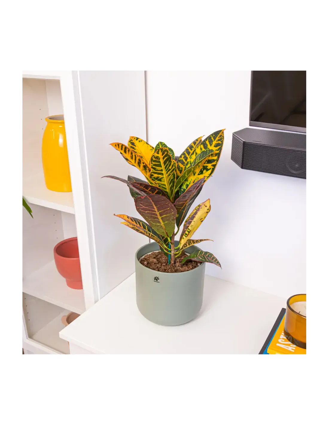 Planta de interior que posee la mayor gama de colores vivos en sus hojas. Sus hojas son duras y con nervaduras que van desde el amarillo hasta el rojizo. (Tiesto no incluido) Dentro de los Crotons existen muchas variedades de diferntes formas y colores en sus hojas. Puede alcanzar los 90 cm de alto. Los colores verdes, amarillos, naranjas y rojos se combinan en sus hojas. Si observamos que es originaria de las islas del Pacífico, marca mucho los cuidados de estas planta: la demanda de humedad.