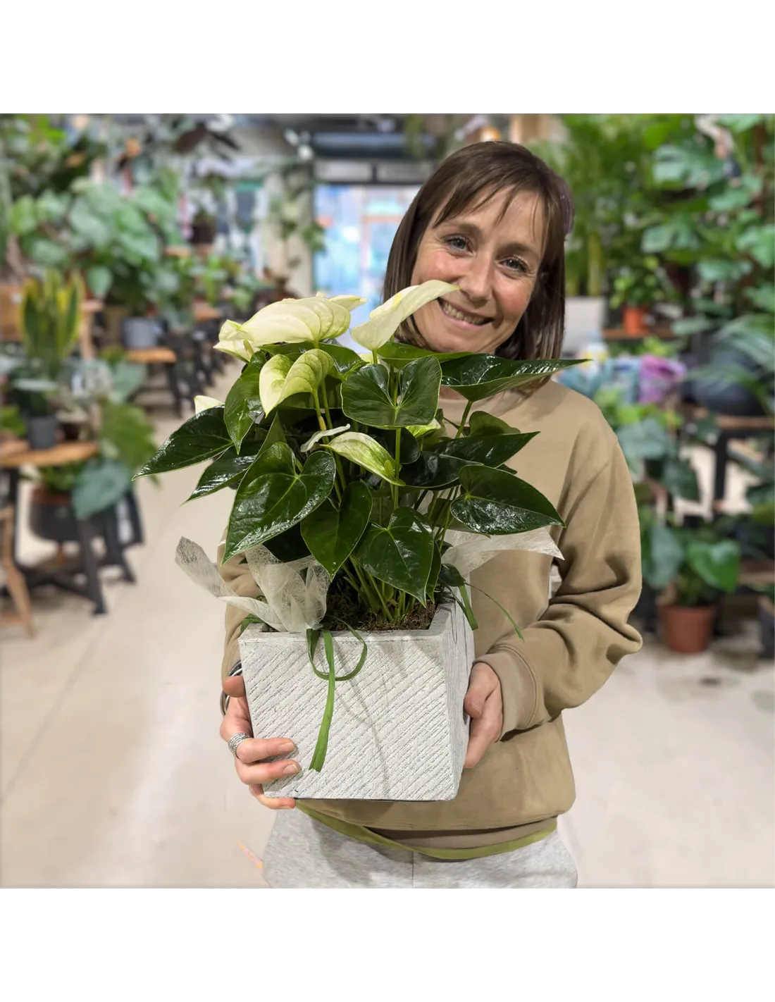Este anthurium blanco en base de fibra es sinónimo de elegancia serena. Sus flores suaves y brillantes contrastan con el verde intenso de las hojas y el acabado texturizado del macetero, creando una pieza decorativa con mucha presencia. Ideal para interiores luminosos o para regalar con estilo en cualquier ocasión. Además, es una planta de interior resistente y fácil de cuidar, perfecta para quienes valoran la belleza sin complicaciones.
