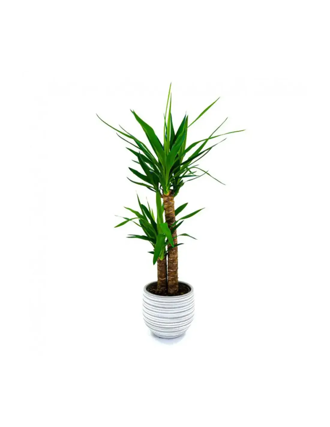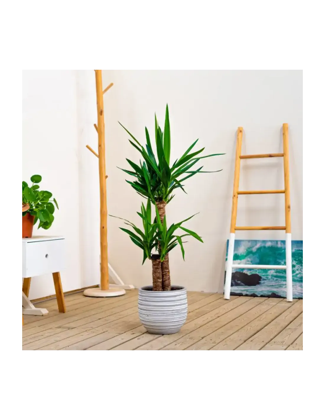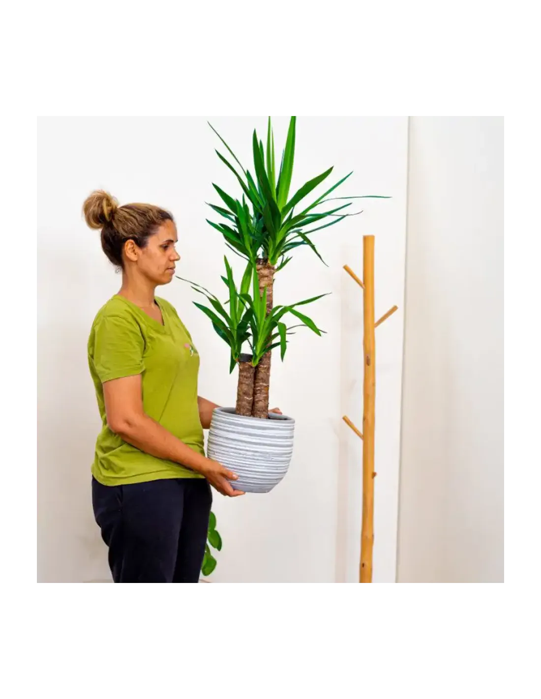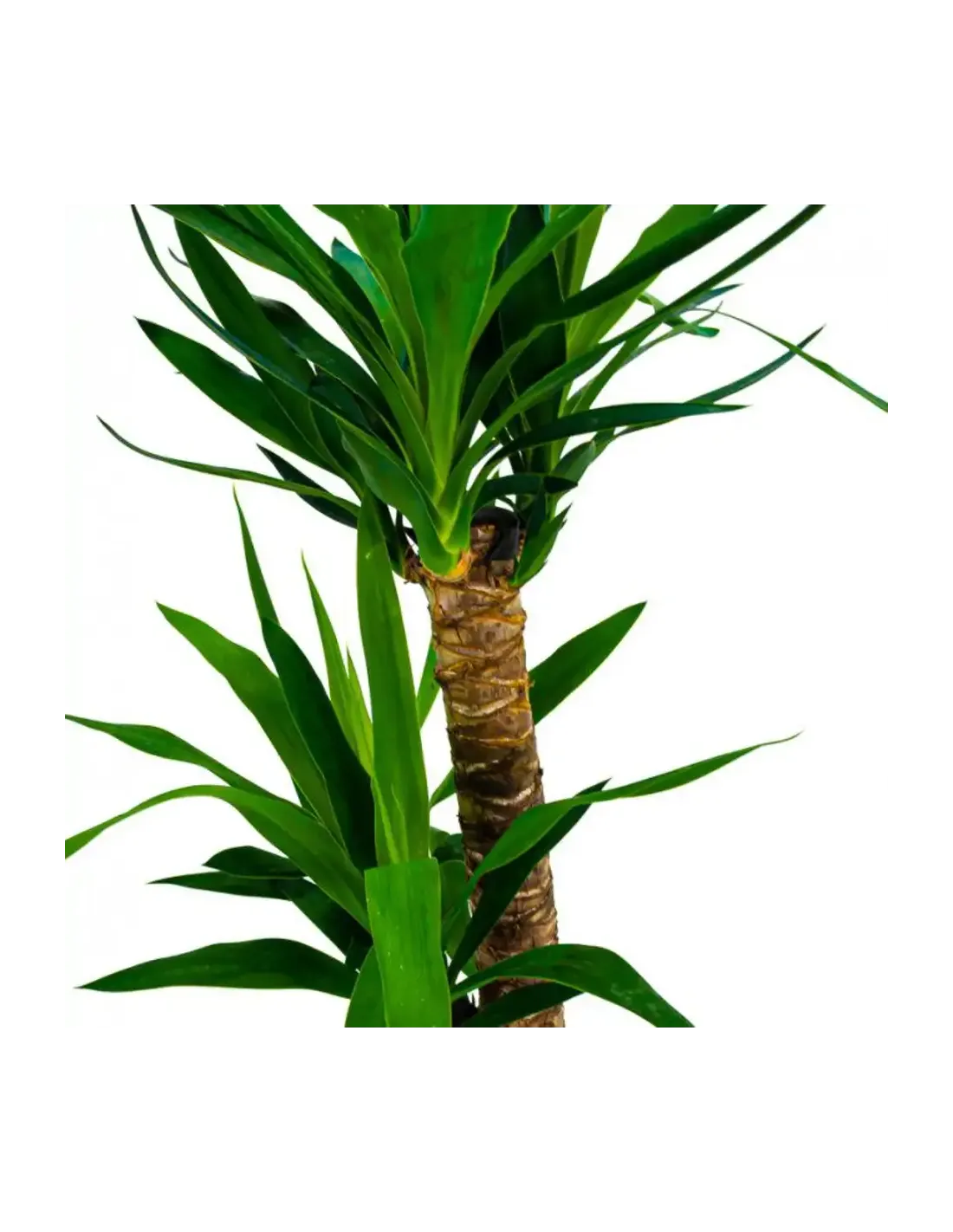 A su inconfundible estampa de criatura del desierto se le suma la alta tolerancia a las heladas y al sol directo. Resistente a la sequedad e inmune a las plagas (Tiesto no incluido) Planta de exterior o de interior. Originaria de Centroamérica es un ejemplar que plantado en el suelo puede llegar a medir 10 metros. Soporta muy bien el frío y el sol directo. Tiene hojas largas y puntiagudas que a medida que la planta va creciendo se van secando y dejan el tronco al descubierto. Cuando llega a ser una espécie adulta hace una floración generalmente de color marfil que puede ser erecta o pendula. Al ser una planta originaria de zonas áridas, están muy capacitadas para vivir con escacez de agua.
