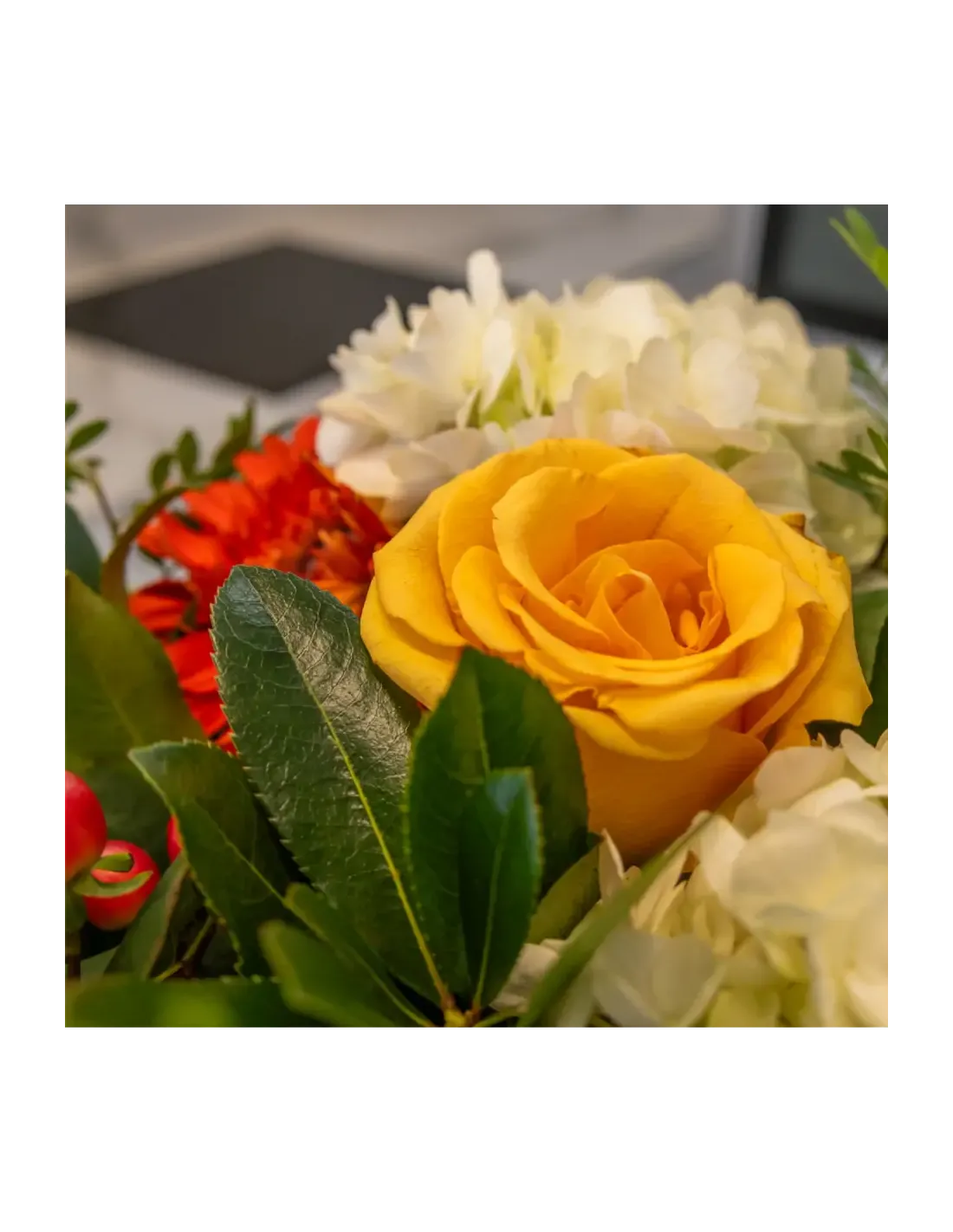 Composición única: combina hortensias, alstroemelias, rosas spray y gerberas en tonos vivos.