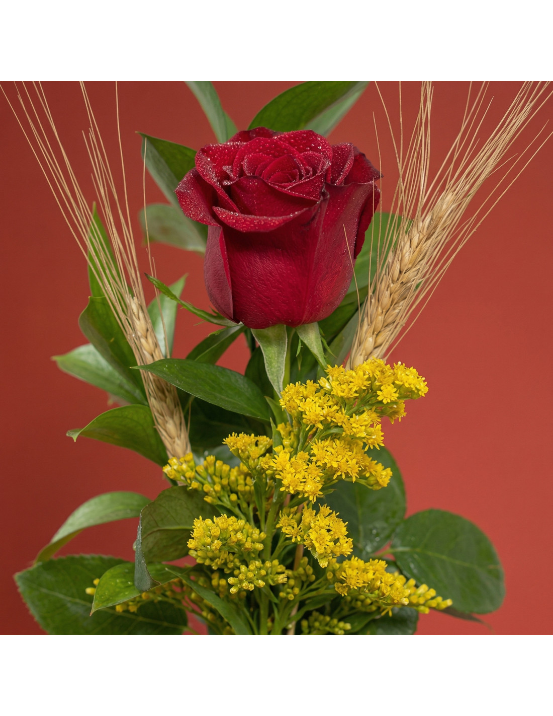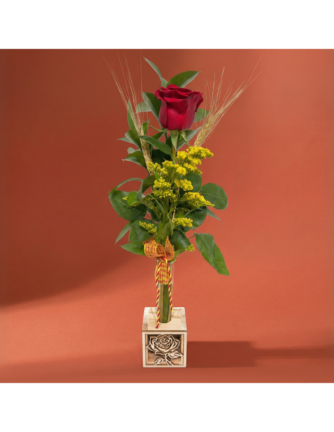 La rosa roja, símbolo universal del amor, se presenta acompañada de verdes naturales y ligeros matices decorativos que aportan frescura sin recargar el diseño. La base de madera, con su forma cuadrada y acabado cuidado, añade estabilidad y un toque cálido que refuerza la sensación de producto bien elaborado.