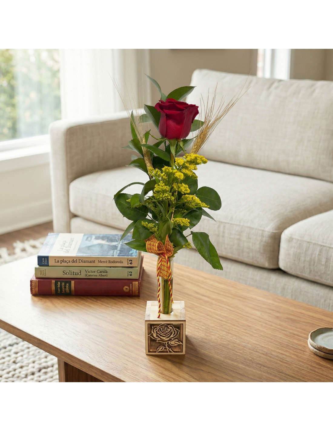 Esta rosa roja en base cuadrada de madera es una propuesta sobria y elegante para celebrar Sant Jordi con un detalle que transmite equilibrio y buen gusto. Su diseño limpio y vertical pone el foco en lo esencial, dejando que la belleza de la rosa y la armonía del conjunto hablen por sí solas.
