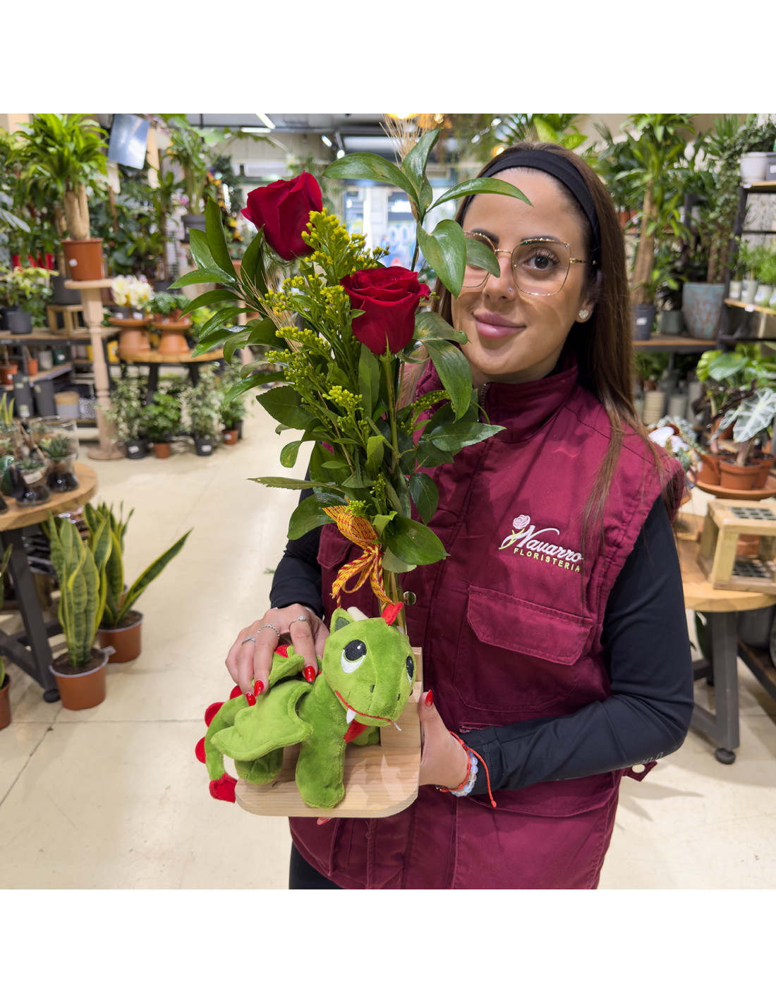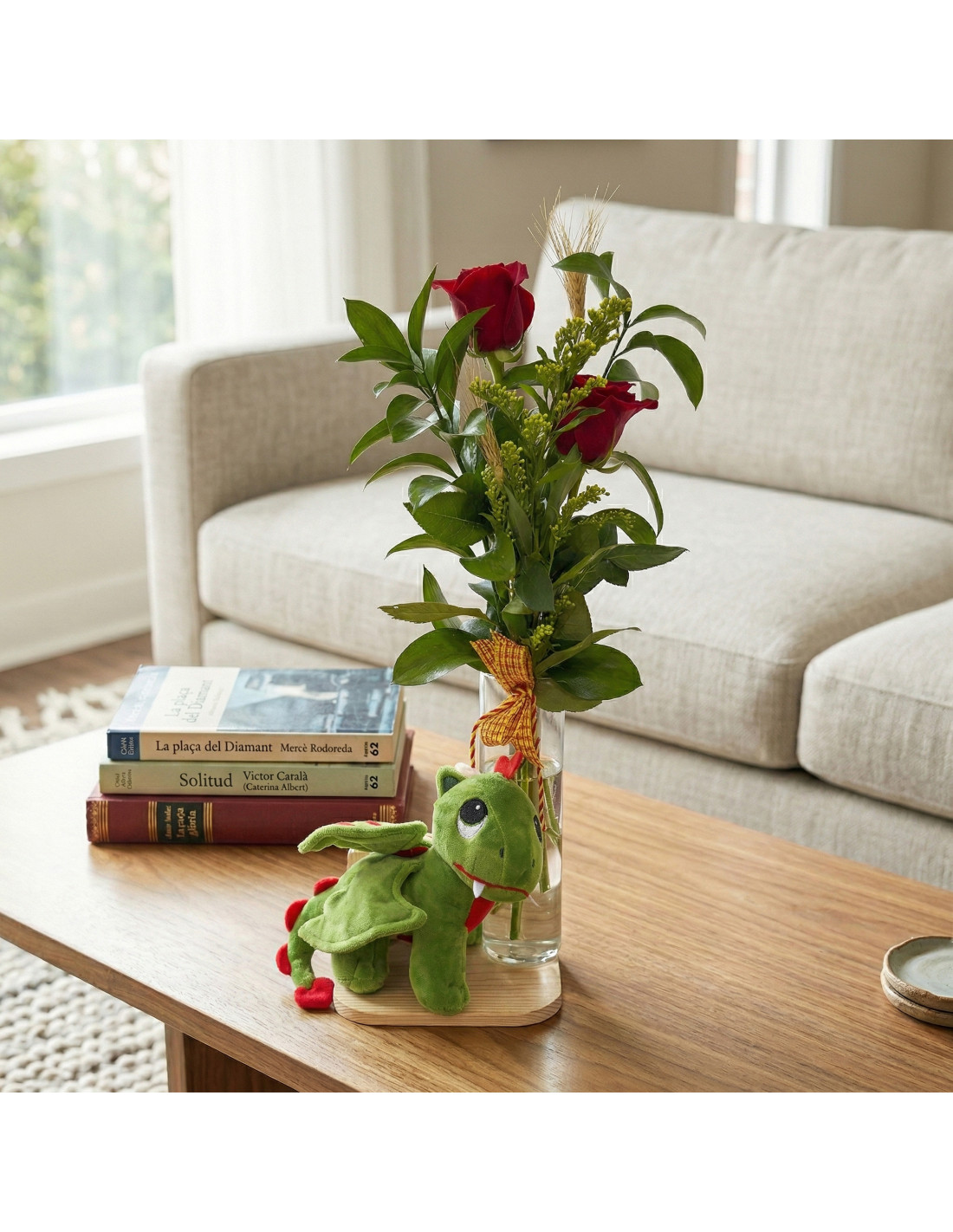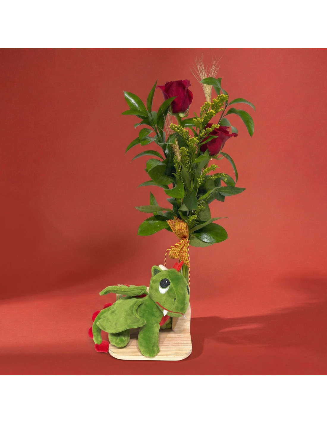 Estas rosas rojas con dragón de peluche grande en base de madera es una propuesta pensada para quienes buscan un regalo de Sant Jordi con más presencia, más ternura y ese punto especial que lo hace inolvidable. Combina la tradición de la rosa con un elemento protagonista que aporta cercanía y personalidad desde el primer momento.