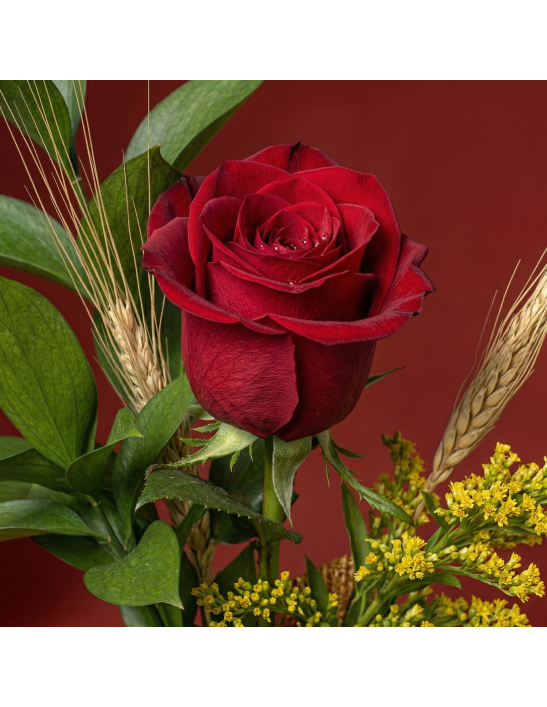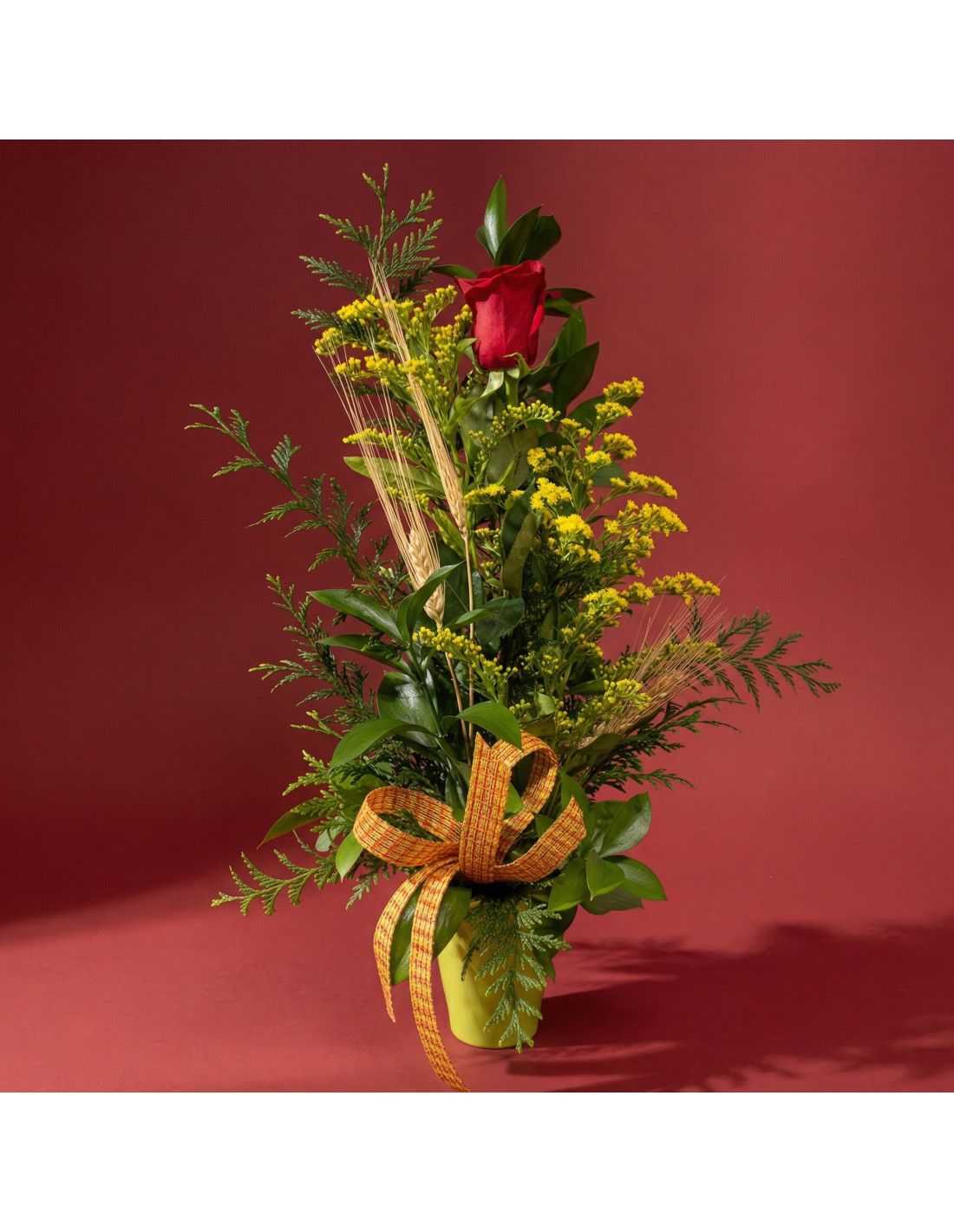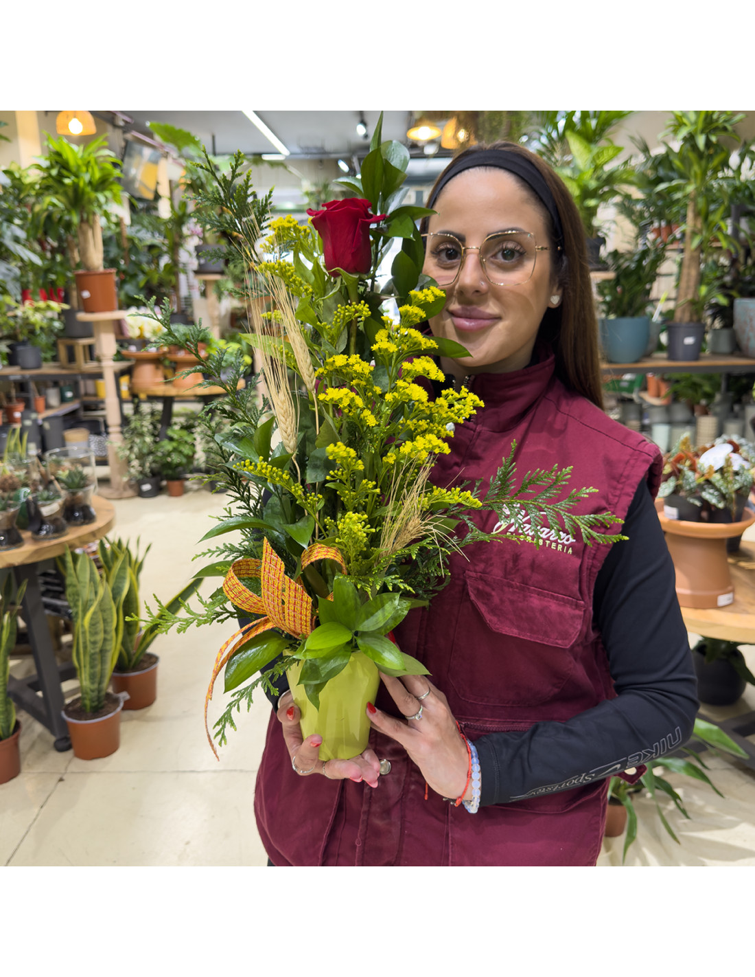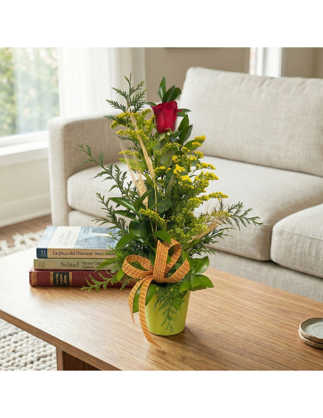 Acompañada de verdes frescos y detalles decorativos, la composición aporta un aire ligero y armonioso, perfecto para quienes valoran los regalos con un toque más natural y menos convencional. El lazo de senyera añade ese guiño tan característico de Sant Jordi, conectando el detalle con la cultura y el significado de la fecha.