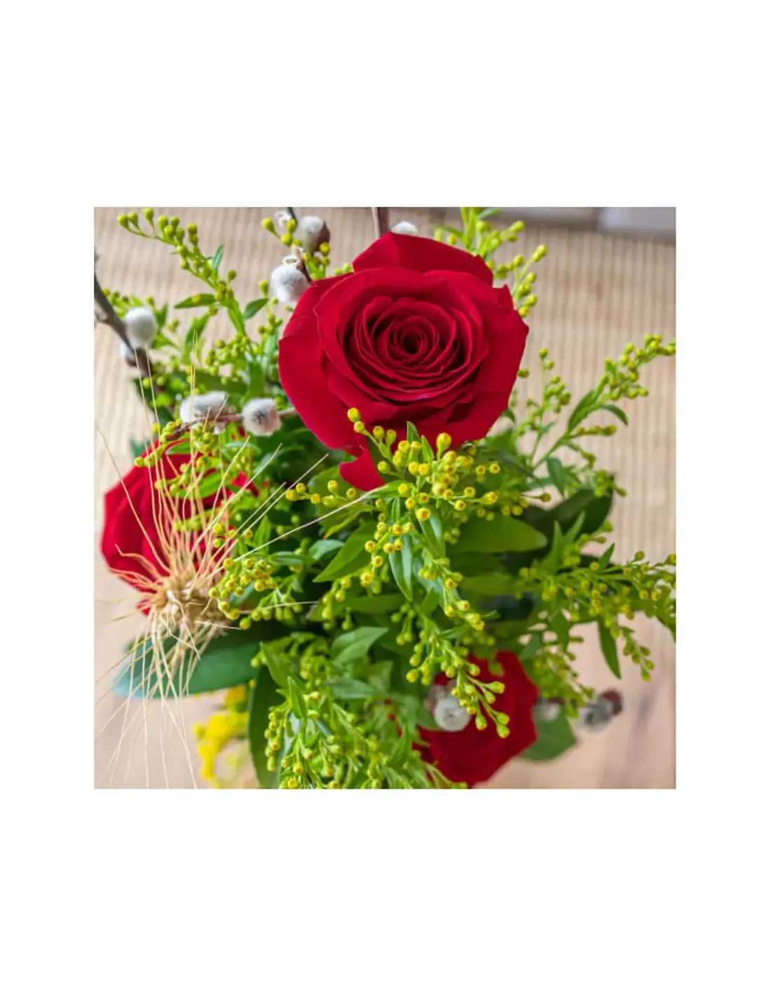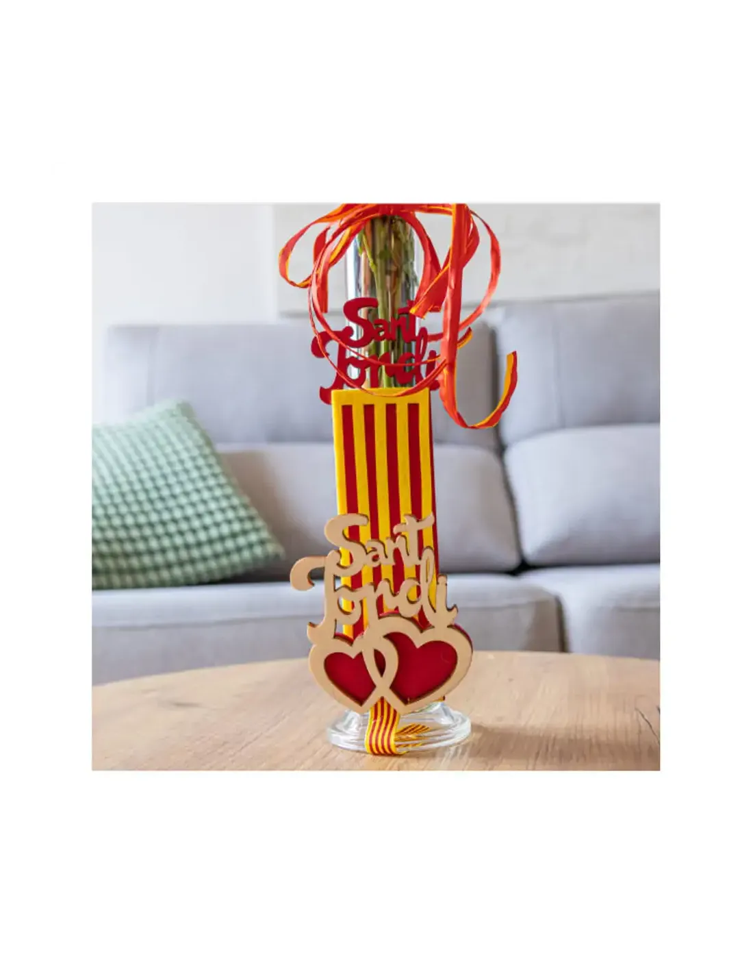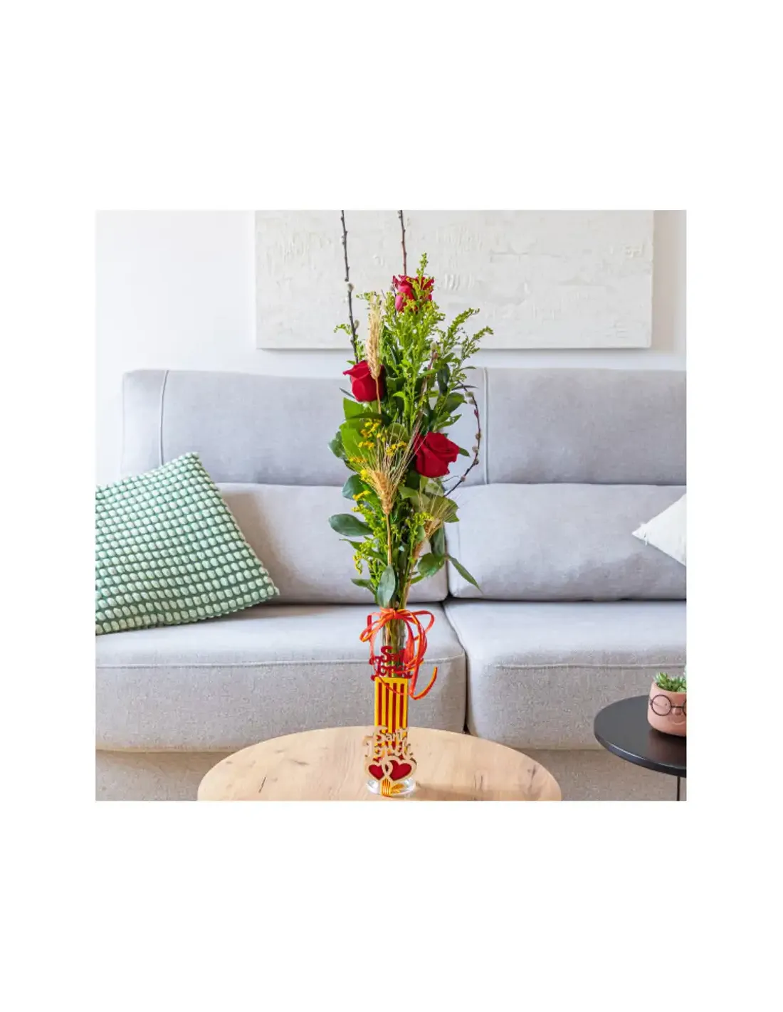 Celebra Sant Jordi con nuestro elegante cilindro de cristal adornado con la senyera y tres impresionantes rosas rojas. Este distintivo arreglo floral también incluye gatell, solidago y ruscus, añadiendo un toque de frescura y vitalidad. La senyera, símbolo de la identidad catalana, junto con las vibrantes rosas rojas, evocan el espíritu de esta festividad tan especial. Presentado en un cilindro de cristal, este regalo es una expresión única de amor y orgullo en Sant Jordi. ¡Sorprende a tus seres queridos con esta hermosa y significativa muestra de aprecio!
