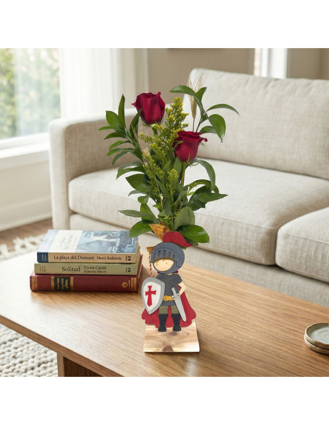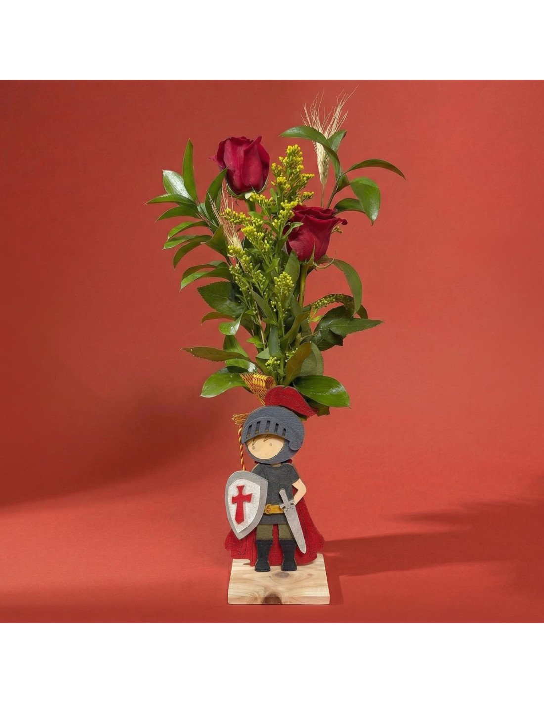 La composición vertical y su base de madera le dan estabilidad y presencia, convirtiéndolo en un elemento decorativo que va más allá del momento puntual. Es una opción ideal para quienes valoran la tradición, para quienes buscan un regalo con identidad y para quienes quieren que su detalle tenga un significado más profundo. Porque en Sant Jordi, regalar también es contar algo más.