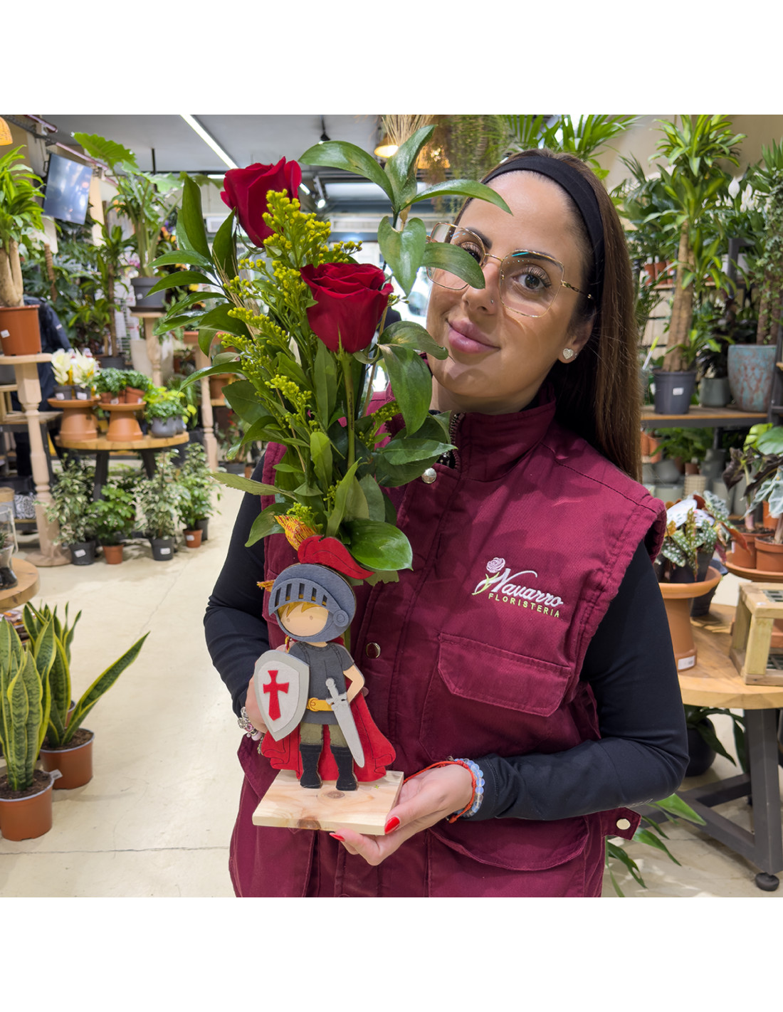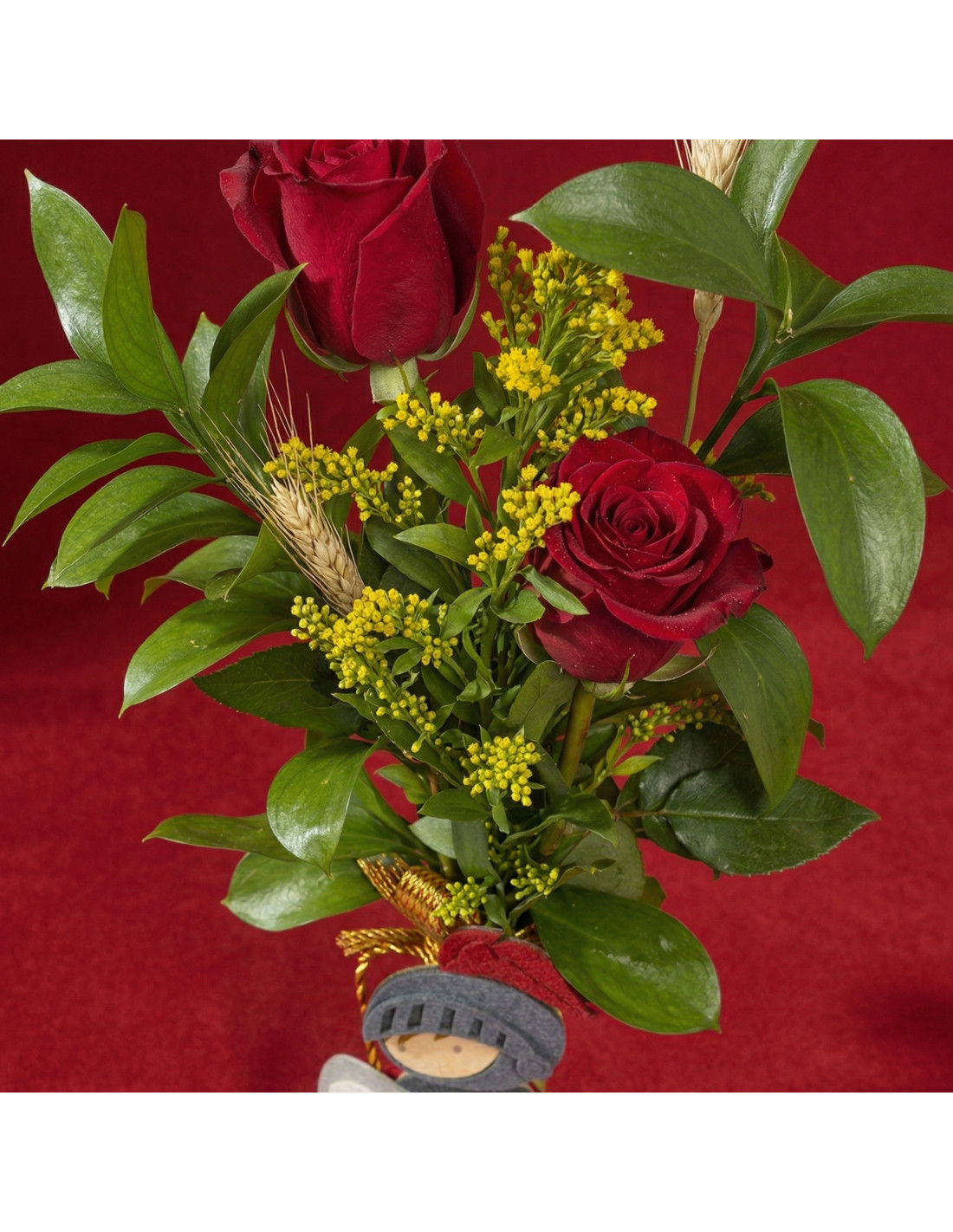 Las dos rosas rojas aportan el componente más romántico, representando amor y admiración, mientras que la figura de Sant Jordi introduce ese valor simbólico que conecta con la leyenda y la cultura. El resultado es un detalle que no solo se regala, sino que también cuenta una historia.