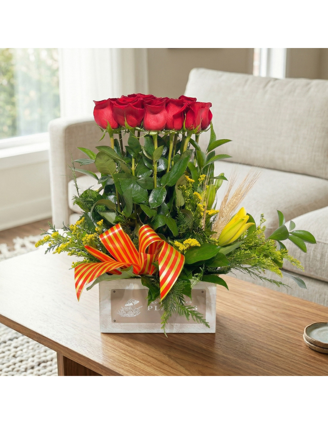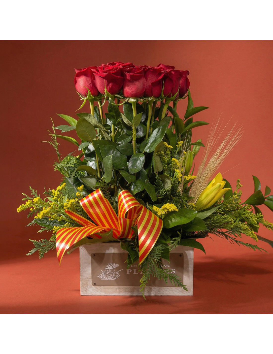 Las rosas rojas, intensas y perfectamente alineadas, simbolizan un amor profundo y decidido, mientras que los verdes naturales y los detalles decorativos aportan equilibrio, textura y un aire sofisticado que eleva el conjunto. La base de madera añade calidez y un toque artesanal que refuerza la sensación de regalo cuidado y especial.