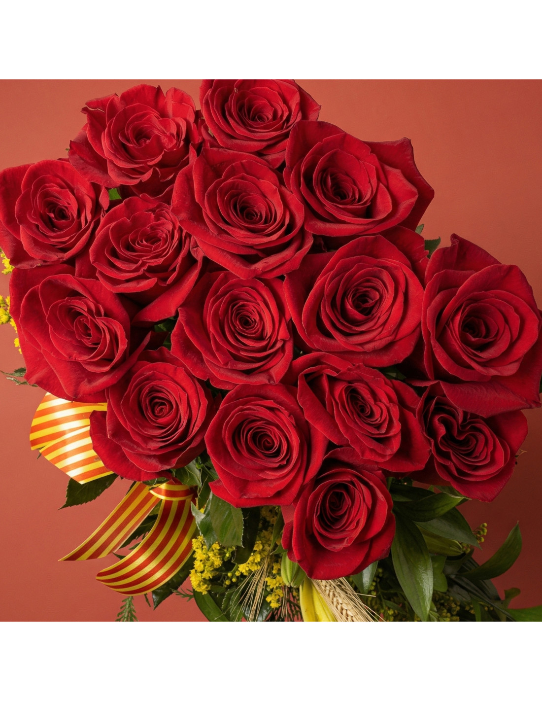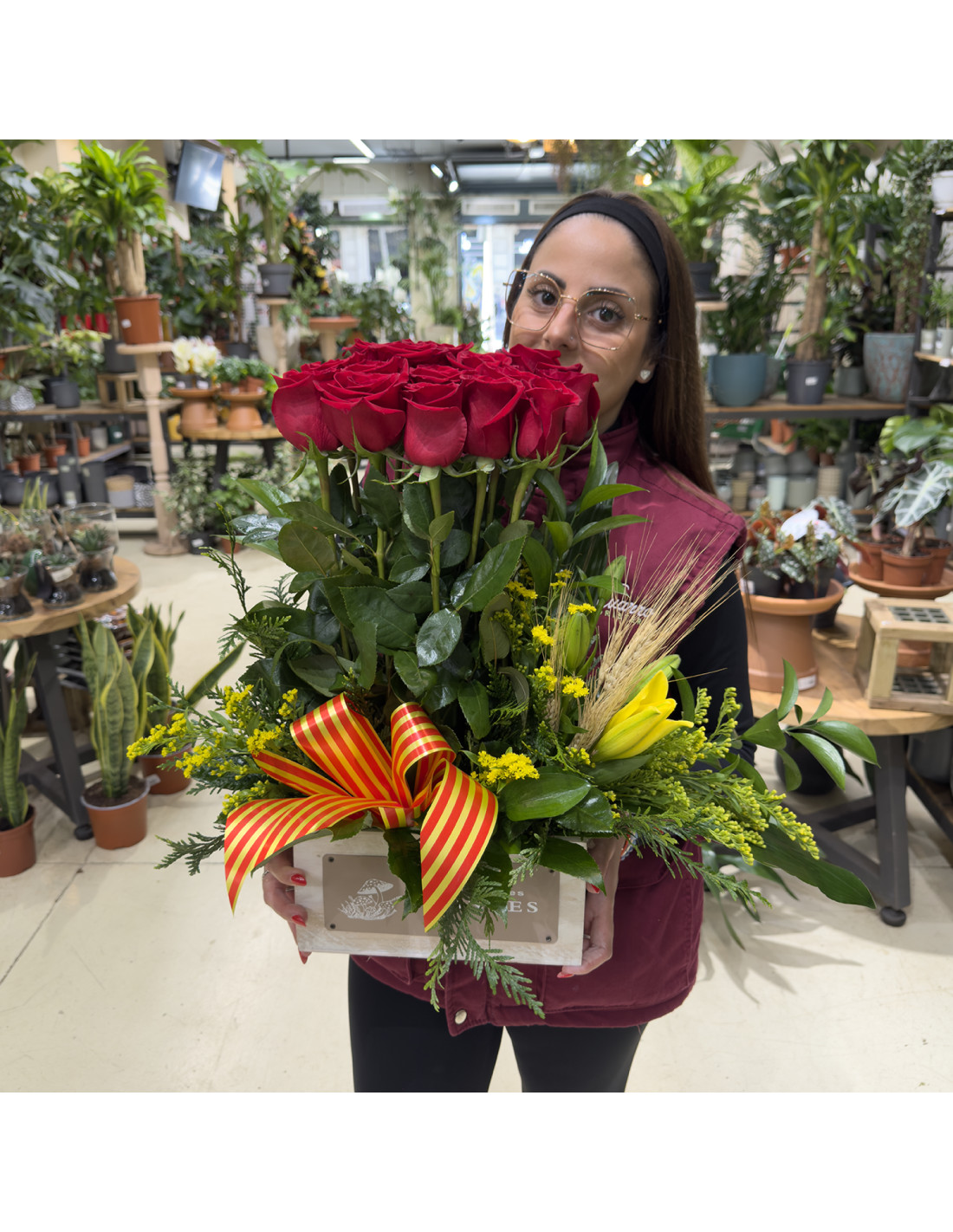 El lazo de senyera, integrado en la composición, conecta este diseño con la esencia de Sant Jordi, aportando identidad y significado cultural. Es una opción ideal para ocasiones en las que se quiere ir un paso más allá, sorprender de verdad y convertir un gesto en una experiencia memorable. Porque hay regalos que se entregan… y otros que dejan huella.